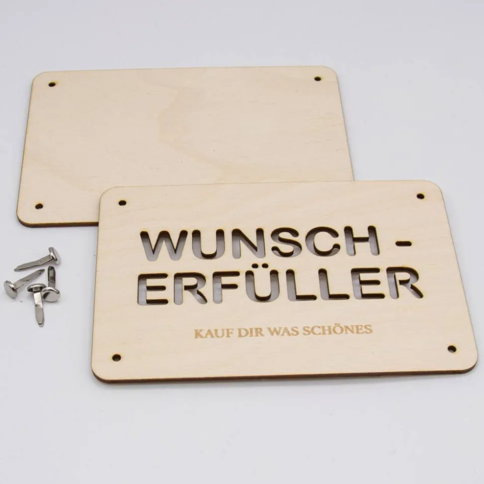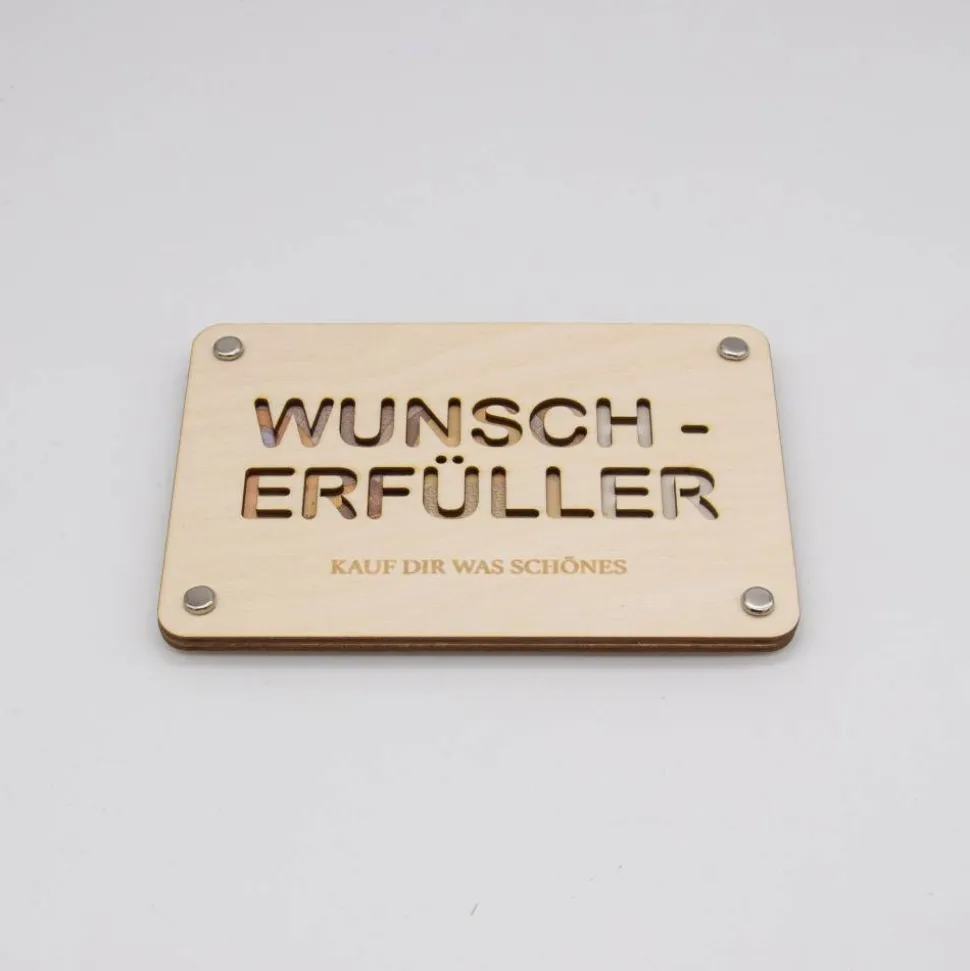 Funktionsweise: Die Karte besteht aus zwei sorgfältig zugeschnittenen Holzplatten, die jeweils 3mm dick sind. Die Platten sind mit präzisen Löchern versehen, durch die kleine Klammern gesteckt werden können, um die Platten zusammenzuhalten. Zwischen diesen beiden Holzplatten wird das Geld platziert. Durch die kunstvoll ausgelaserten Stellen des Wunscherfüller-Motivs ist das Geld sichtbar und wird so Teil des Gesamtdesigns.