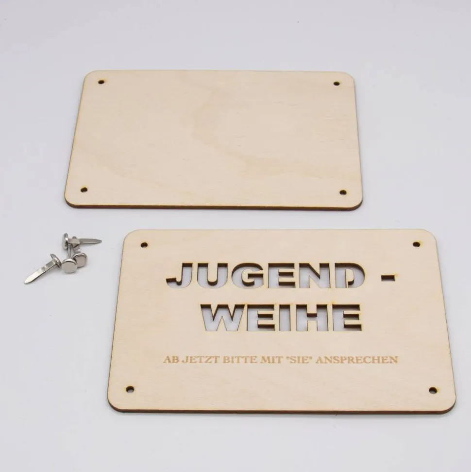 Funktionsweise: Die Karte besteht aus zwei sorgfältig zugeschnittenen Holzplatten, die jeweils 3mm dick sind. Die Platten sind mit präzisen Löchern versehen, durch die kleine Klammern gesteckt werden können, um die Platten zusammenzuhalten. Zwischen diesen beiden Holzplatten wird das Geld platziert. Durch die kunstvoll ausgelaserten Stellen des Jugendweihe-Motivs ist das Geld sichtbar und wird so Teil des Gesamtdesigns.