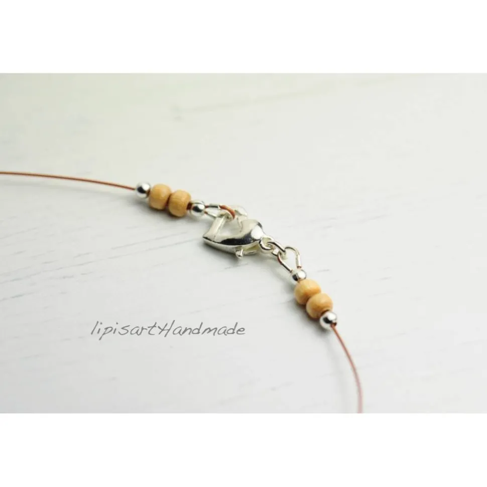 Der Holzanhänger hängt an einem edlen kupferfarbenen Juwelierdraht.