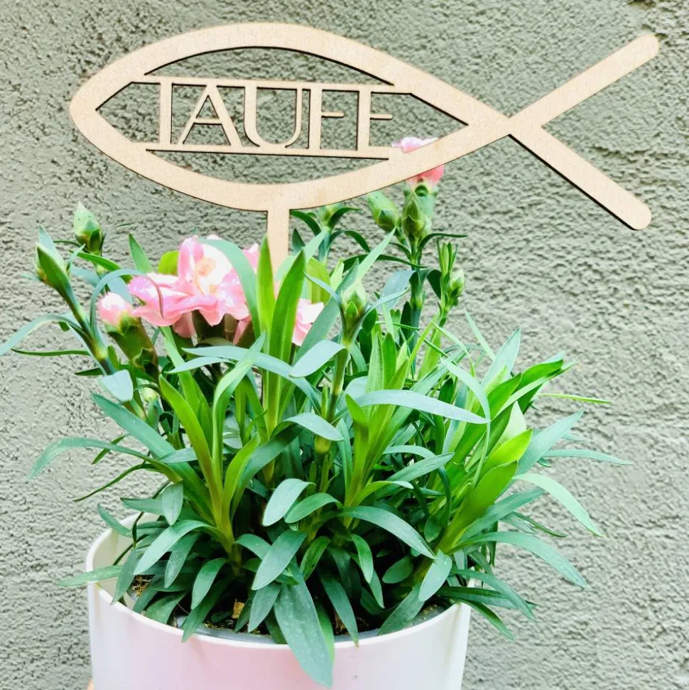 Es gibt den Pflanzenstecker mit je dem Wort Taufe, Kommunion oder Firmung in entweder Schreibschrift (Design 1-3) oder Druckschrift (Design 4-6).