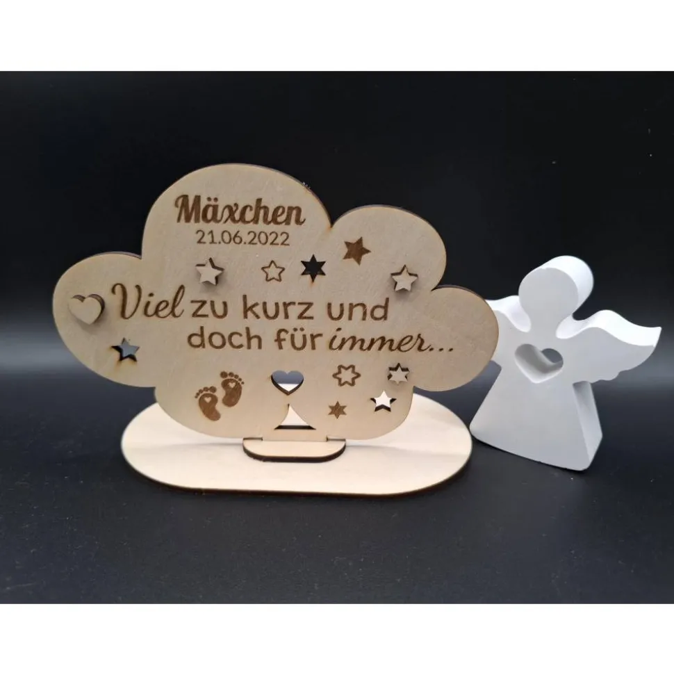 Das Schild kann mit einem LED-Teelicht kombiniert werden, das sanftes Licht spendet und eine beruhigende Umgebung schafft. Dieses Wolkenholzschild ist ein Symbol der Liebe und des Gedenkens und hilft, die Verbindung zu Deinem geliebten Sternenkind aufrechtzuerhalten. Wir fertigen unsere Produkte mit viel Liebe und hoffen so ein klein wenig Trost und Frieden in schwierige Zeiten zu bringen.
