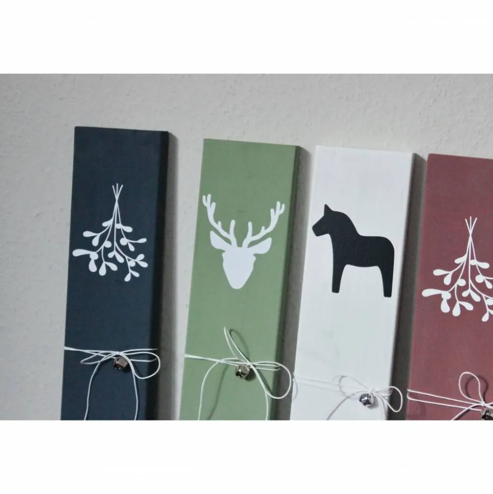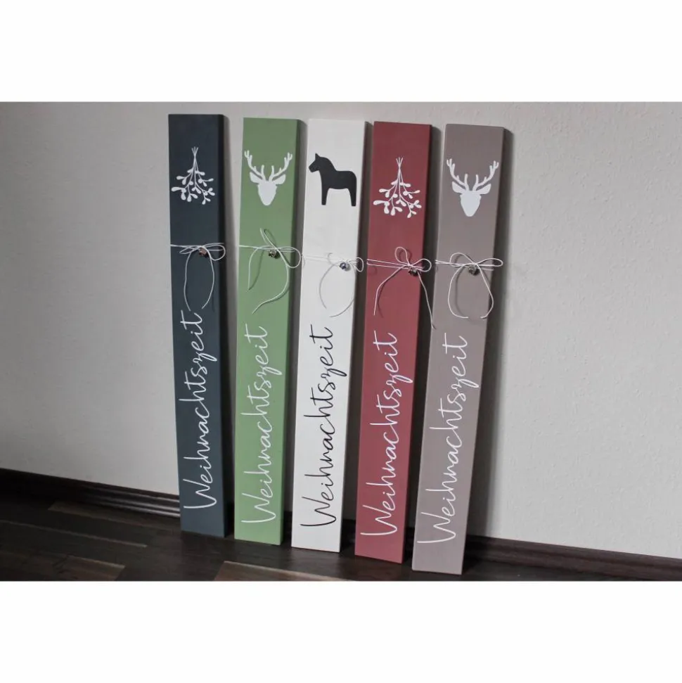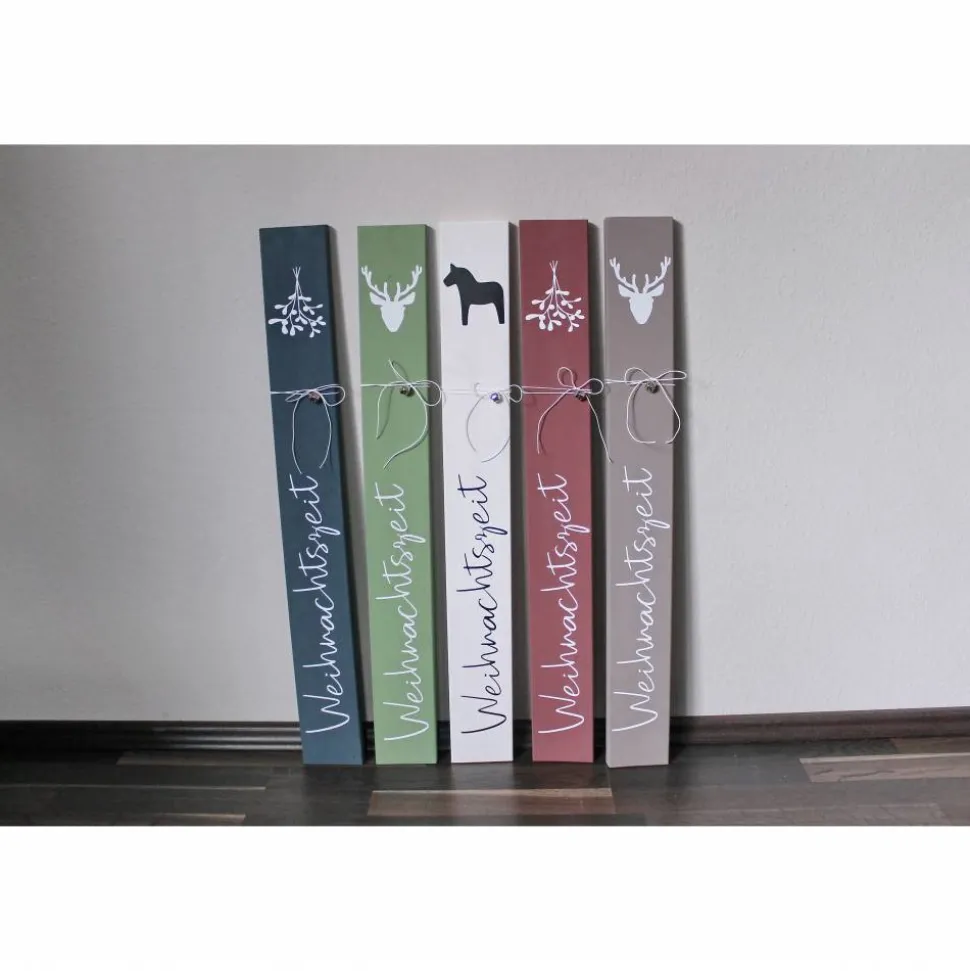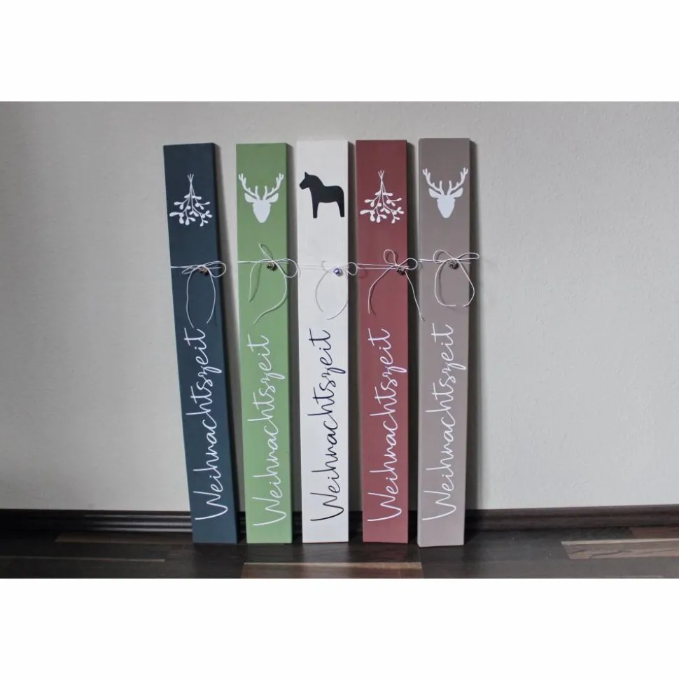 Die Latten werden von mir geschliffen, mit einer sanft-matten Kreidefarbe gestrichen und anschließend mit einer weißen Vinylfolie beplottet. Eine schmale, weiße Schnur, um den oberen Bereich gewickelt, mit einem Glöckchen versehen und mit einer Schleife gebunden, verpasst der Latte den finalen Schliff.