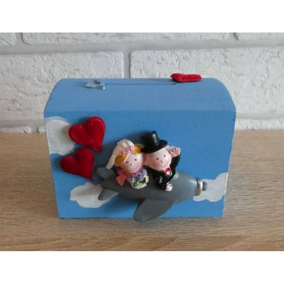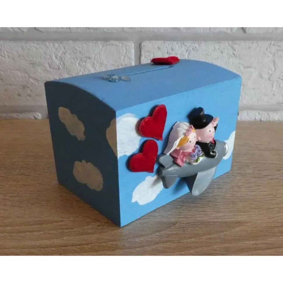 Die Holzspardose wurde mit Acrylfarben bemalt und mit einer Brautpaarfigur, Stoffherzen und Strasssteinen verziert.