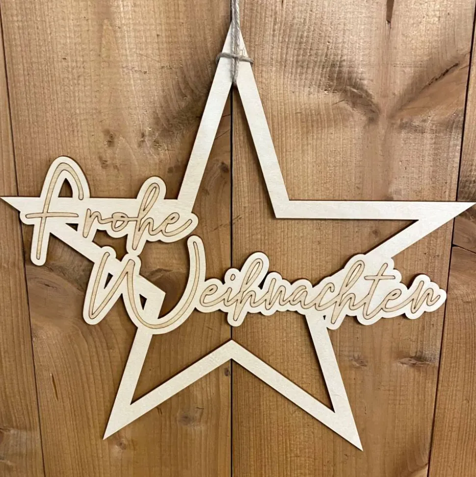 Setze ein festliches Highlight an deiner Haustür mit dem Stern aus Holz mit der Gravur „Frohe Weihnachten“!