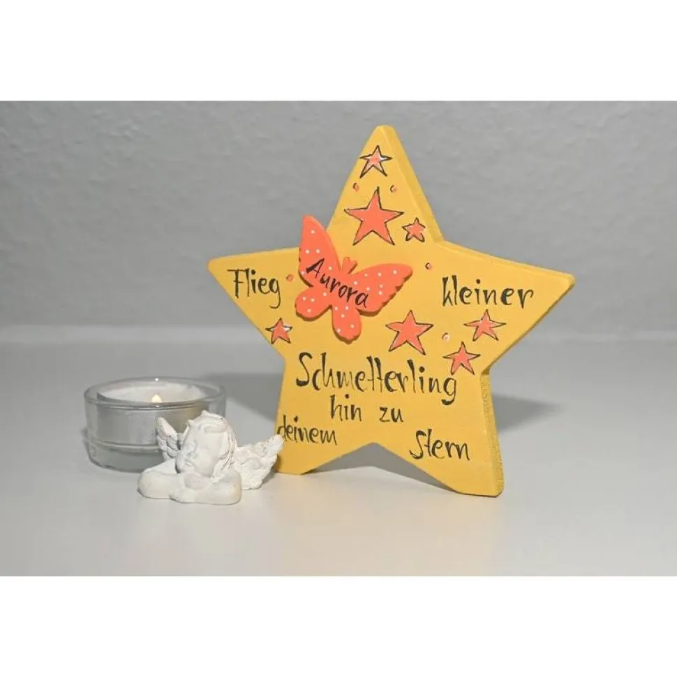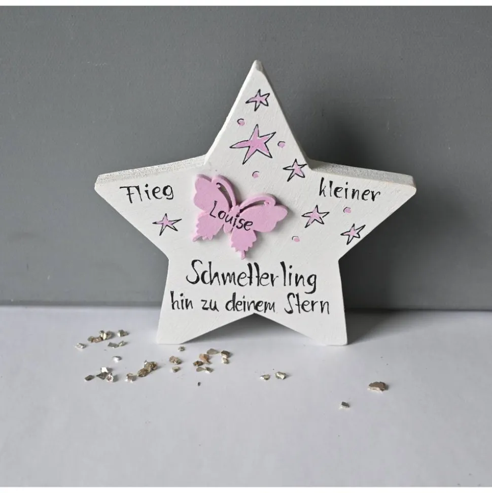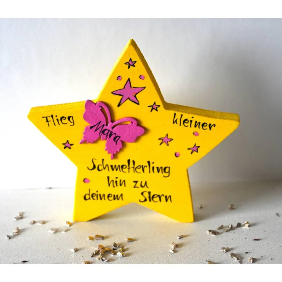 Jeder Holzstern wird mit hochwertiger Acrylfarbe in Ihrer Wunschfarbe grundiert und auf der Vorderseite von Hand bemalt und beschriftet. Der separat aufgeklebte Schmetterling trägt den Namen Ihres Sternenkindchens. Zum Schutz wird der Stern beidseitig mit Acryllack versiegelt.