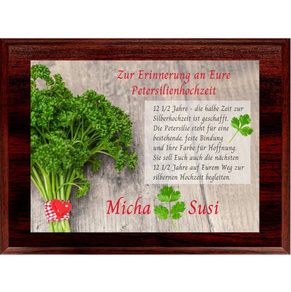 12 1/2 Jahre – die halbe Zeit zur Silberhochzeit ist geschafft. Die Petersilie steht für eine bestehende, feste Bindung und Ihre Farbe für Hoffnung. Sie soll Euch auch die nächsten 12 1/2 Jahre auf Eurem Weg zur silbernen Hochzeit begleiten.