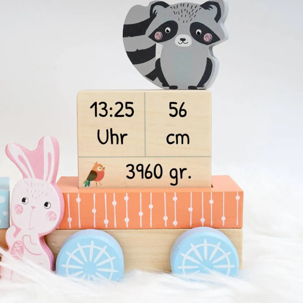 Die Waggons sind bestückt mit den Geburtsdaten von eurem Kind. Zusätzlich bekommt ihr die vier kleinen Holztiere die auf den Bildern ebenfalls zu sehen sind.