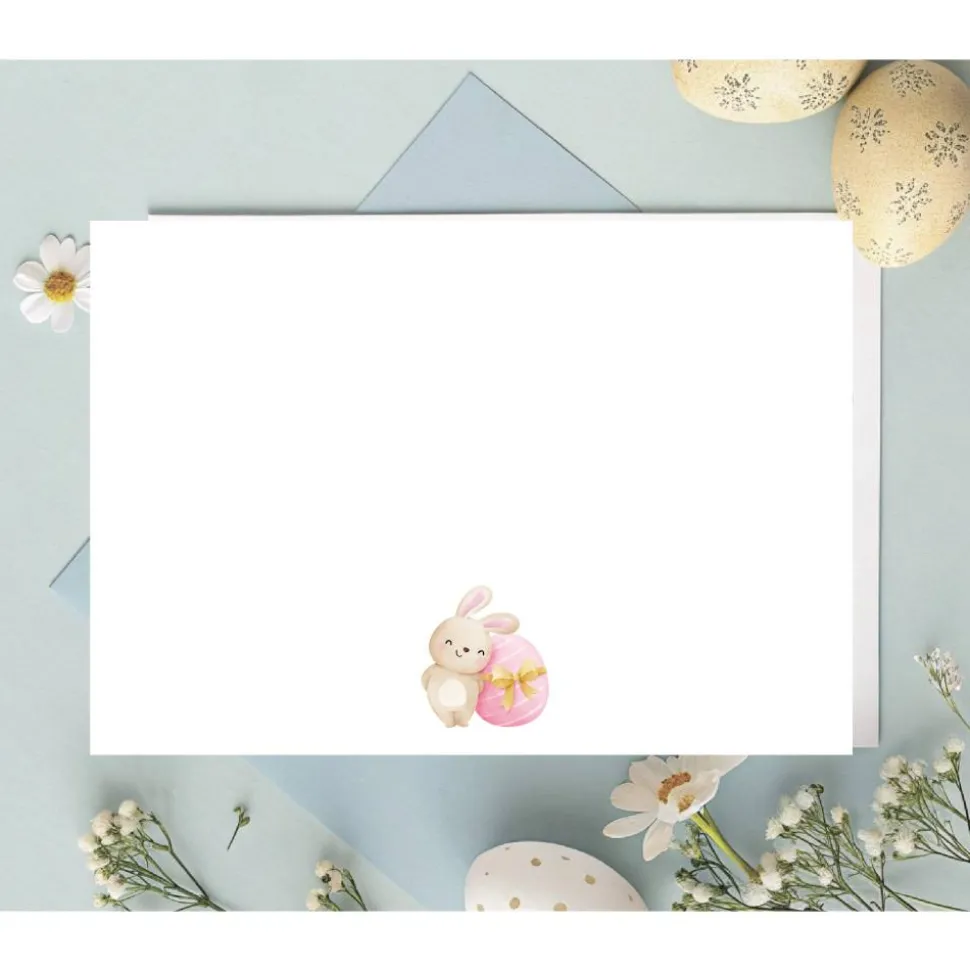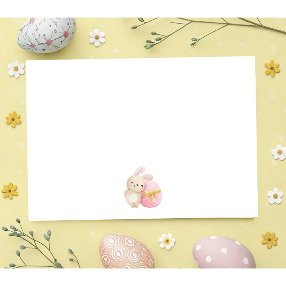 Im Zentrum der Osterkarte mit Umschlag stehen fünf süße Häschen, jedes mit seinem ganz eigenen Charakter: verspielt, neugierig, frech oder verträumt – gemeinsam sorgen sie für einen hinreißenden Hingucker. Die kleinen Fellfreunde sind mit zarten Details und sanften Farben gestaltet, wodurch das Motiv warm, freundlich und absolut herzerwärmend wirkt. Umgeben werden die Häschen von einer Vielzahl österlicher Elemente: bunte Ostereier mit liebevollen Mustern, zarte Frühlingsblumen und kleinen Karotten – all das verleiht der Häschen Ostergrußkarte einen lebendigen und frühlingshaften Look. Die harmonische Farbkombination aus Pastell- und Naturtönen unterstreicht die verspielte, frische Atmosphäre des Osterfestes. Auch auf der Rückseite der Karte für Ostern befindet sich ein kleiner Hase, der die Ostergruß Karte abrundet.