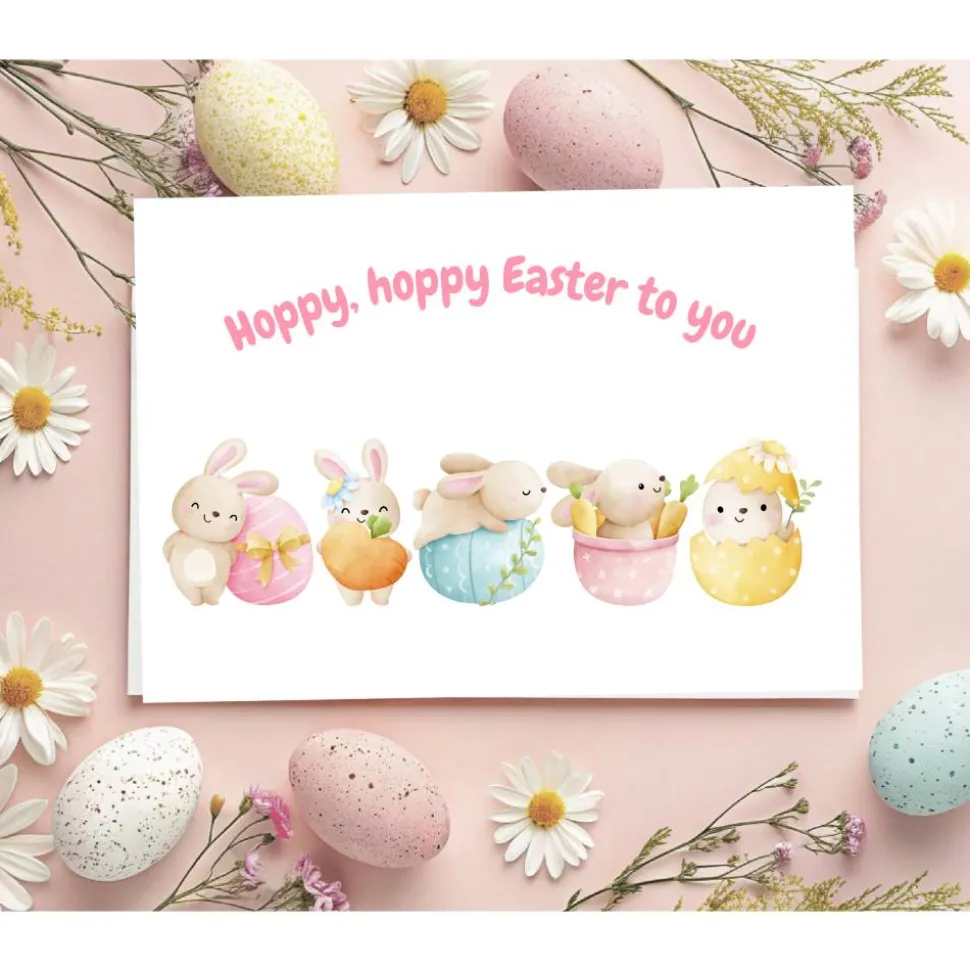 Die fröhliche Aufschrift „Hoppy, hoppy Easter to you“ spielt mit dem englischen Wort „hoppy“ und zaubert durch ihren humorvollen, liebevollen Ton zusätzlich gute Laune. Die farbenfrohe, moderne Schriftart fügt sich perfekt in das Design ein und setzt einen fröhlichen Akzent, der die Ostergrüße besonders herzlich wirken lässt. Der Hintergrund ist hell und freundlich gehalten, sodass die liebevollen Illustrationen klar hervorstechen und die Happy Easter Karte eine harmonische, einladende Gesamtwirkung erhält.