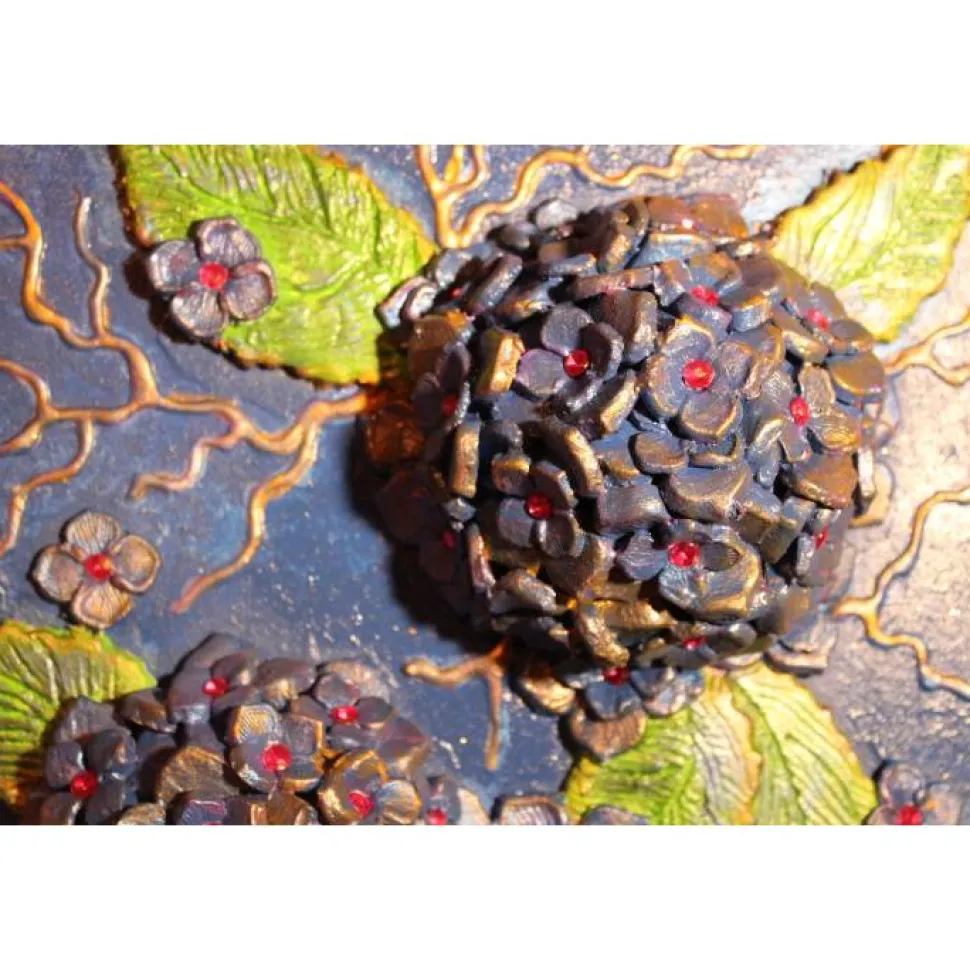 Leuchtende Acrylfarben, Glitter, handgefertigte Blüten und Blätter aus Modelliermasse.
