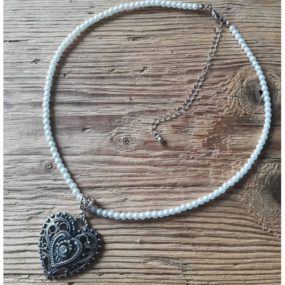 Kette mit weißen Glasperlen (4mm) und einem schönen, dekorativen Herzanhänger aus Metall mit klarem Glasschliff-Stein aus der Kollektion Alpenflüstern