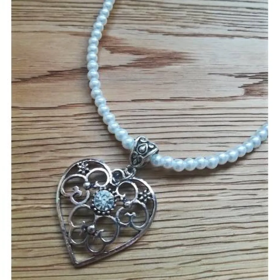 Kette mit weissen Glasperlen und einem schönen, filigranen Herzanhänger aus Metall mit klarem Glasschliff-Stein