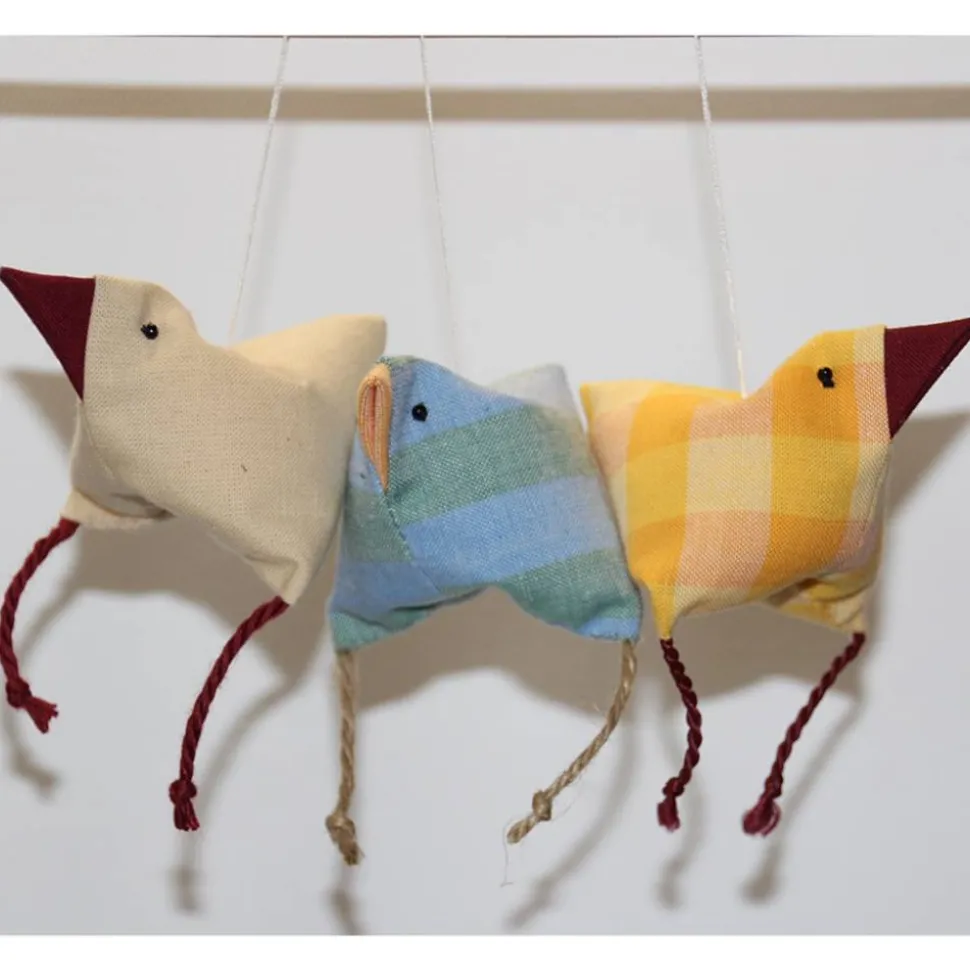 Die Hühner/Vögel sind aus Baumwollstoff gefertigt, die Beinchen sind aus Juteschnur, Baumwollkordel oder Satinkordel, gefüllt werden sie mit Wolle. Zum Aufhängen ist ein Baumwollzwirn angebracht.