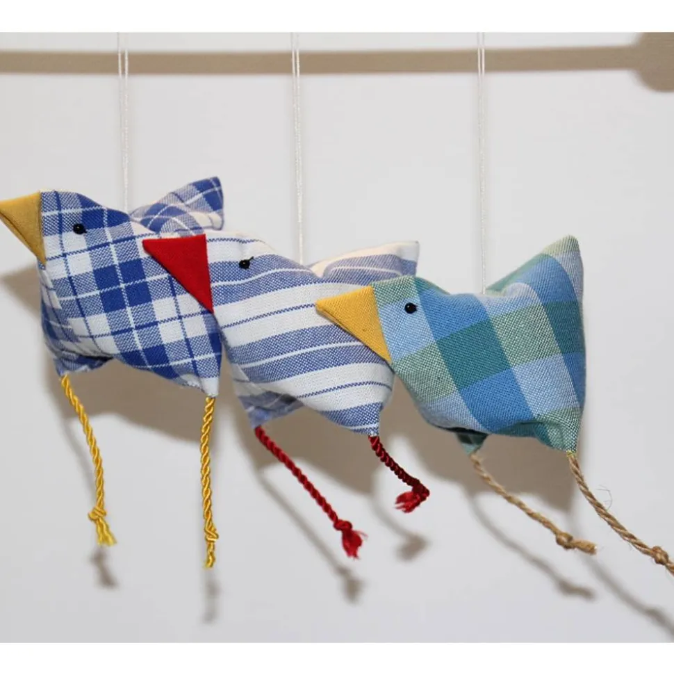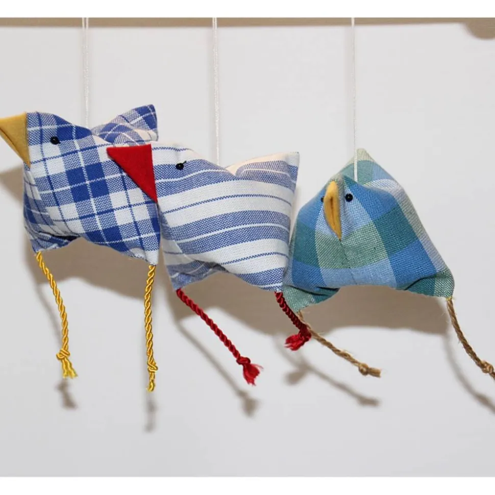 Die Hühner/Vögel sind aus Baumwollstoff gefertigt, die Beinchen sind aus Juteschnur, Baumwollkordel oder Satinkordel, gefüllt werden sie mit Wolle. Zum Aufhängen ist ein Baumwollzwirn angebracht.