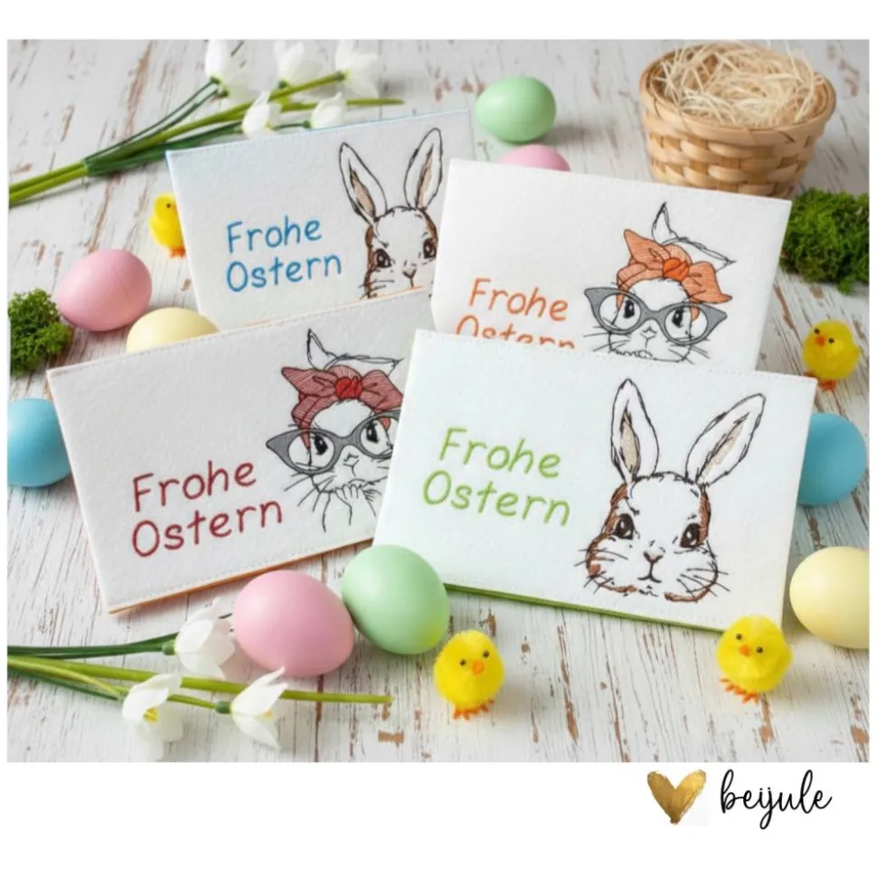 Die Vorderseite aus weißem Filz wird durch ein detailreich gesticktes Hasenmotiv veredelt. Die Stickfarbe für „Frohe Ostern“ sowie das Kopftuch kann individuell angepasst werden – so entsteht ein persönliches Geschenk ganz nach Ihren Wünschen.