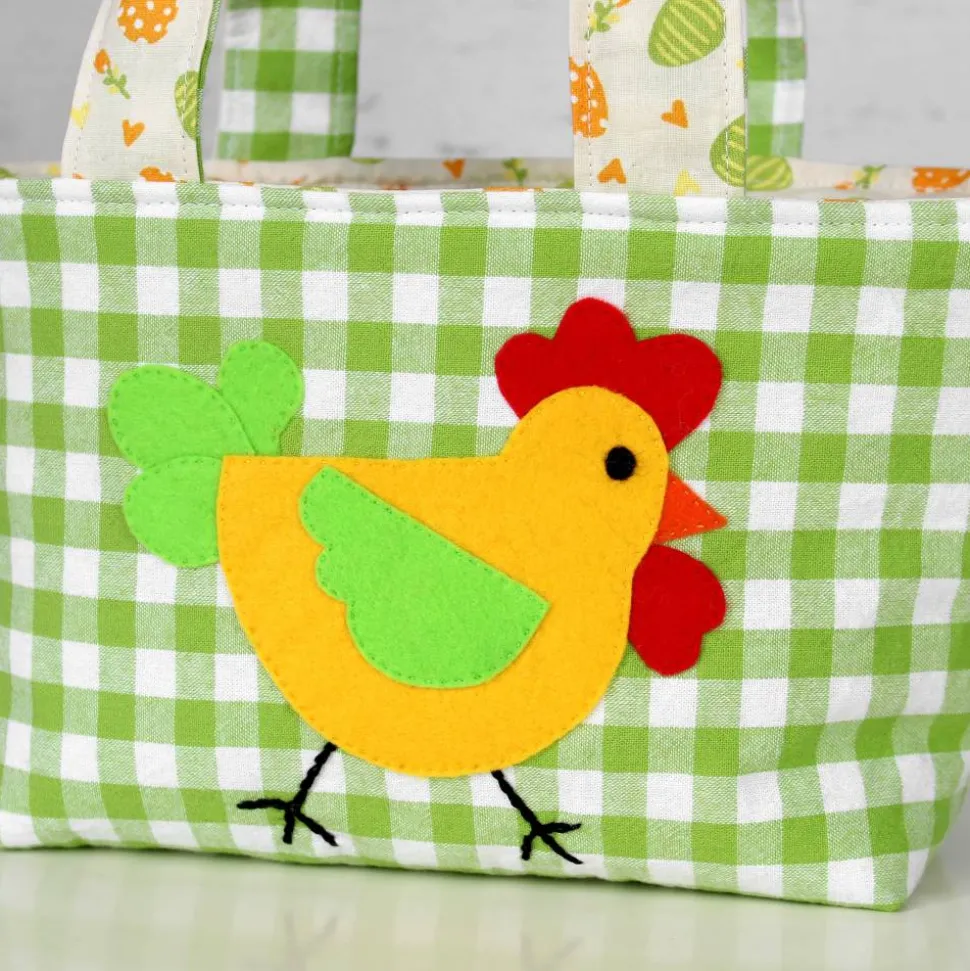 Die hellgrün/weiß karierte Seite aus Baumwollstoff wurde mit einer Huhnapplikation aus Filz verziert. Wird das Täschchen umgestülpt kommt der hellgelbe Stoff mit den Ostereiern zur Geltung.