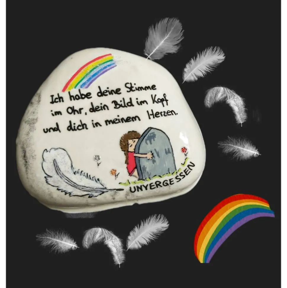 Dieser Trauerstein ist eine Spezialanfertigung und wird nur für Sie gemalt. Er trägt die Essenz Ihrer Erinnerungen, Liebe und Ihres Verlusts. Jeder Stein ist ein Symbol für die Einzigartigkeit eines Lebens, für Momente, die unvergessen bleiben. Sie sind Kunstwerke mit Herzblut und Hingabe, geschaffen, um die Schönheit des Lebens und die Liebe festzuhalten. Jeder Stein ist ein Unikat, das dazu bestimmt ist, zu berühren und zu verzaubern.