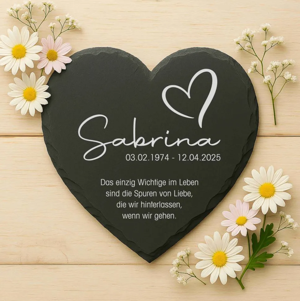 Setze ein liebevolles Andenken mit einer individuell gravierten Schiefertafel in Herzform. Diese handgefertigte Gedenktafel besteht aus hochwertigem Schiefer, der in Deutschland produziert und von einem kleinen Familienunternehmen bezogen wird. Jede Schiefertafel ist ein Unikat, geprägt durch natürliche Farbunterschiede, Einschlüsse und kleine Unebenheiten – so wird dein Erinnerungsstück einzigartig.