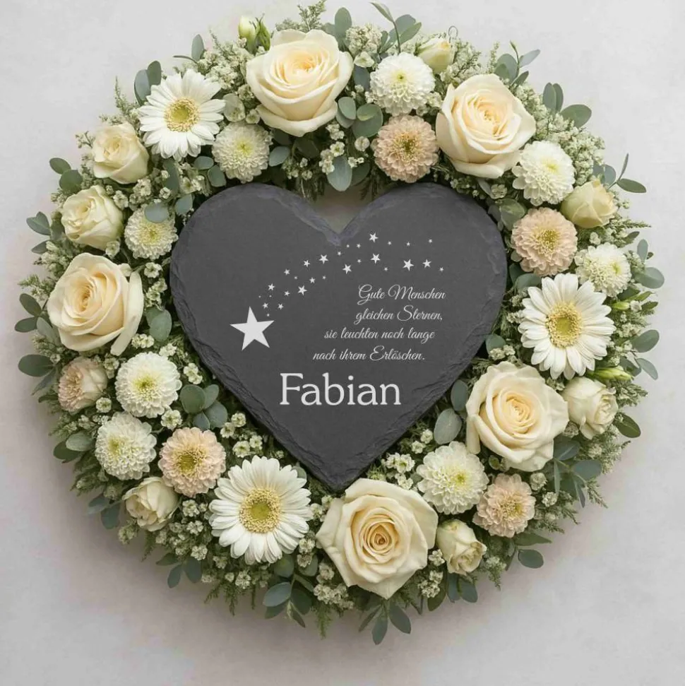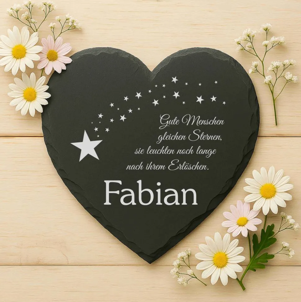 Setze ein liebevolles Andenken mit einer individuell gravierten Schiefertafel in Herzform. Diese handgefertigte Gedenktafel besteht aus hochwertigem Schiefer, der in Deutschland produziert und von einem kleinen Familienunternehmen bezogen wird. Jede Schiefertafel ist ein Unikat, geprägt durch natürliche Farbunterschiede, Einschlüsse und kleine Unebenheiten – so wird dein Erinnerungsstück einzigartig.