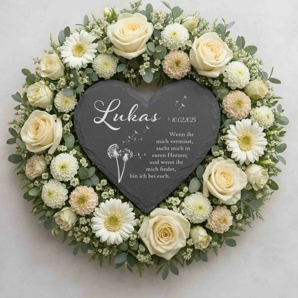 Setze ein liebevolles Andenken mit einer individuell gravierten Schiefertafel in Herzform. Diese handgefertigte Gedenktafel besteht aus hochwertigem Schiefer, der in Deutschland produziert und von einem kleinen Familienunternehmen bezogen wird. Jede Schiefertafel ist ein Unikat, geprägt durch natürliche Farbunterschiede, Einschlüsse und kleine Unebenheiten – so wird dein Erinnerungsstück einzigartig.