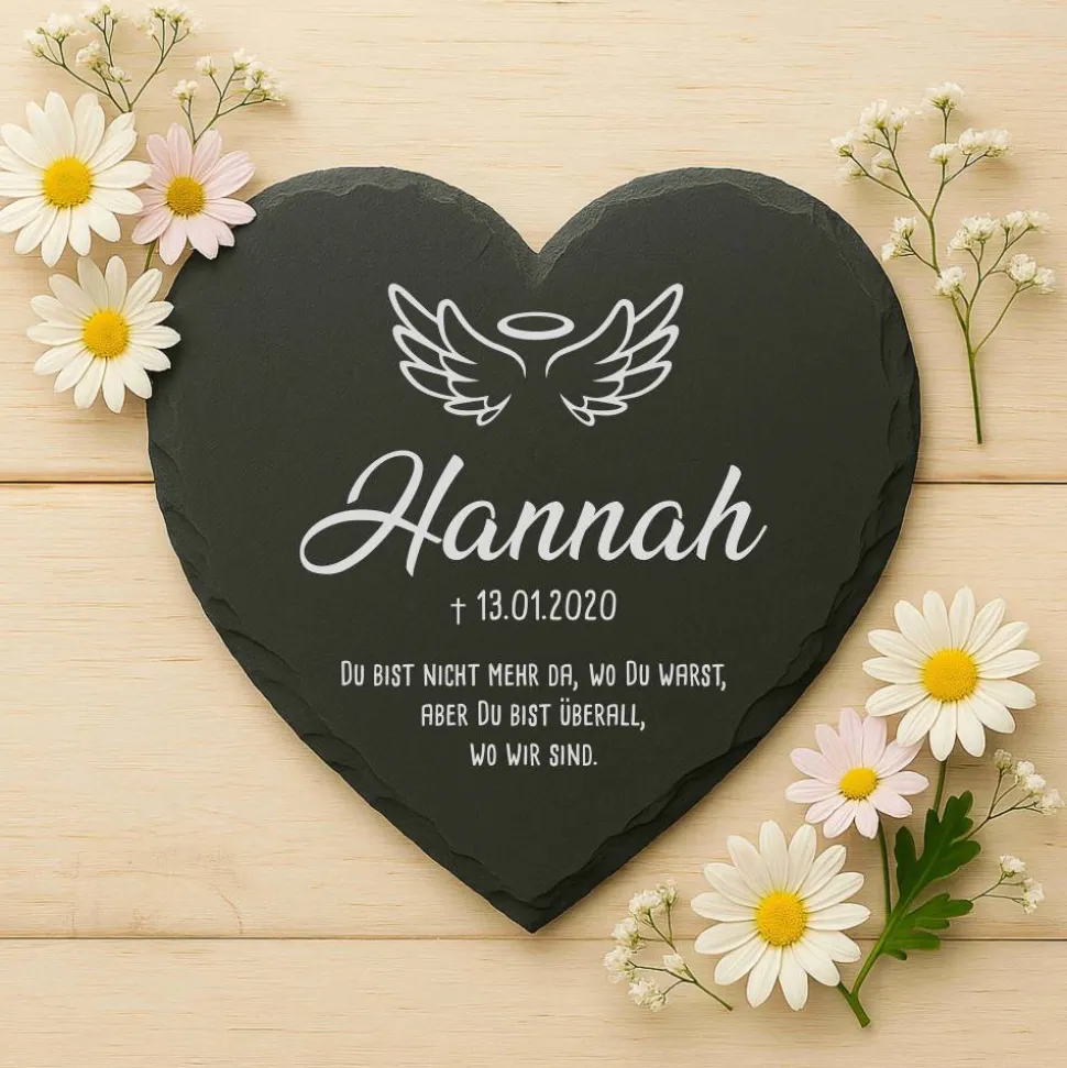 Setze ein liebevolles Andenken mit einer individuell gravierten Schiefertafel in Herzform. Diese handgefertigte Gedenktafel besteht aus hochwertigem Schiefer, der in Deutschland produziert und von einem kleinen Familienunternehmen bezogen wird. Jede Schiefertafel ist ein Unikat, geprägt durch natürliche Farbunterschiede, Einschlüsse und kleine Unebenheiten – so wird dein Erinnerungsstück einzigartig.