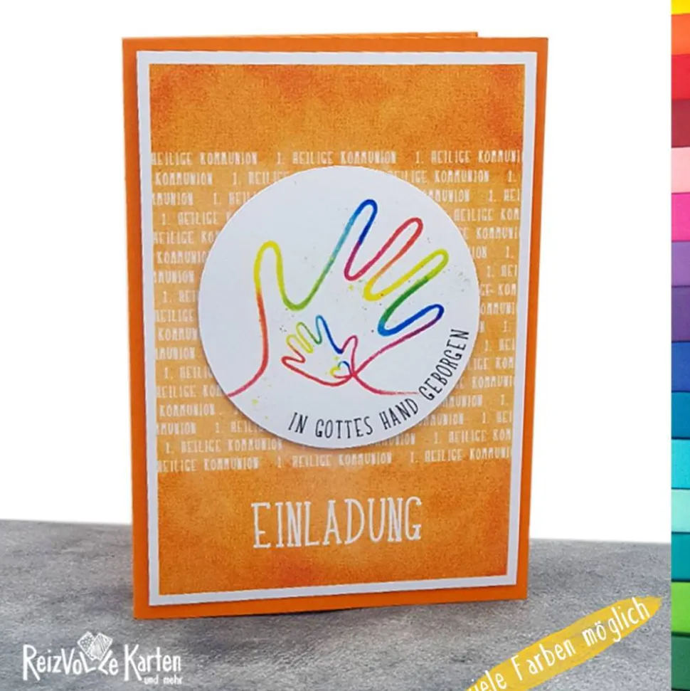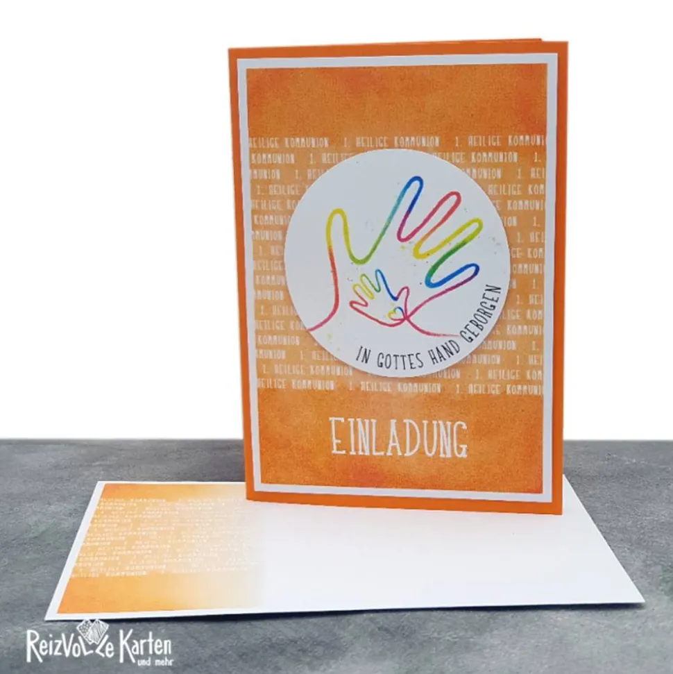 Entdecke die besondere Einladungskarte zur Kommunion zum Thema „In Gottes Hand geborgen“. Diese Doppelkarte wird ganz individuell für dich gefertigt und hebt sich durch ihre hochwertige Verarbeitung und liebevolle Gestaltung hervor.