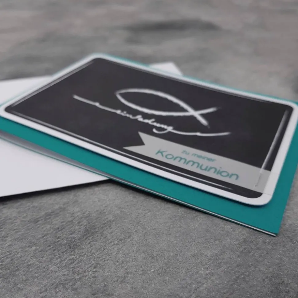 Gestalte deine persönliche Einladung zur Kommunion, Konfirmation, Taufe oder Firmung im stilvollen Design „Fisch Kreidezeichnung“! Wähle aus verschiedenen Kartenfarben (siehe Foto) und trage einfach oben deine Wunschfarbe und den Anlass ein. Die Doppelkarte wird inklusive weißem Doppel-Einlegeblatt sowie passend gestaltetem weißen Umschlag geliefert.