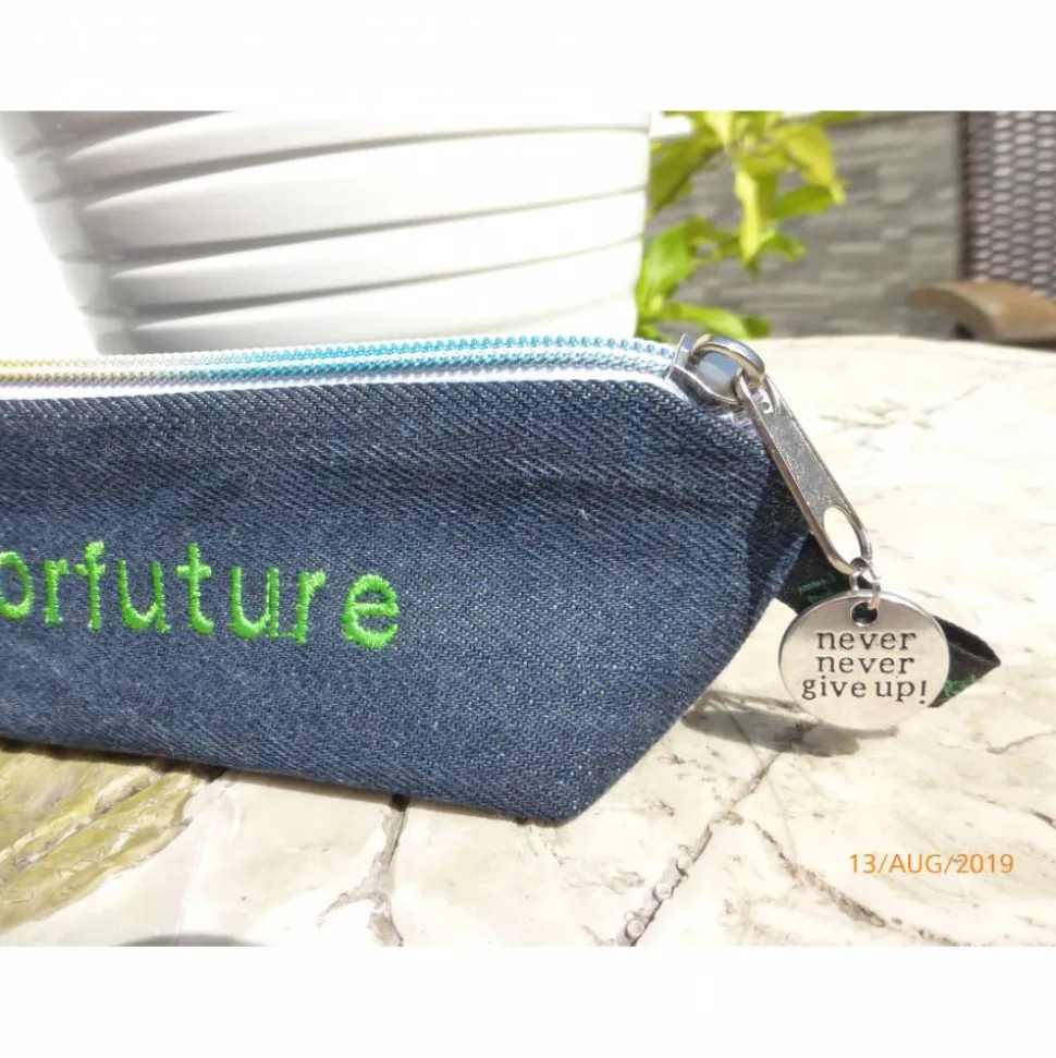 Upcycling aus einer Jeans und einem tollen Baumwollstoff, versehen mit einem Regenbogenreißverschluss und einem Anhänger mt der Message ’never never give up‘.