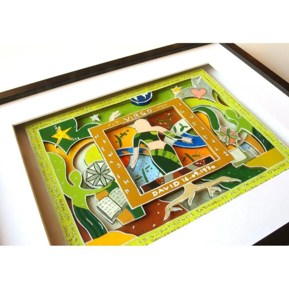 Auch die Sternzeichen-Bilder entstehen zuerst als künstlerisches Acryllack-Gemälde und werden dann als Print in sehr aufwändiger Handarbeit zu einem 3D-Kunstobjekt mit bis zu 5 Bild-Ebenen umgearbeitet, was jedes einzelne Stück wieder in ein Unikat verwandelt.