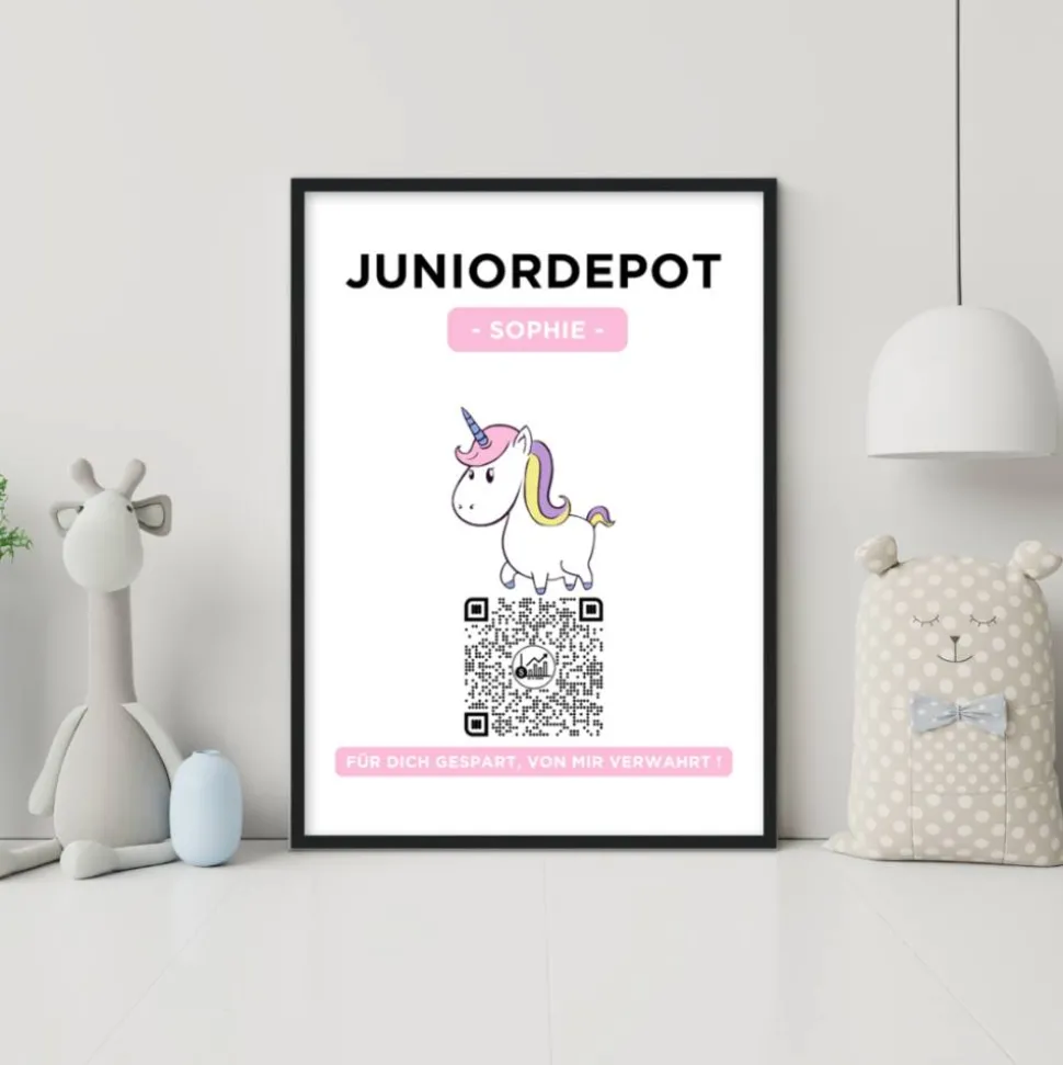 Juniordepot | Personalisiertes Geldgeschenk | Aktie ETF Kryptowährung QrCode Bild | Motiv Einhorn