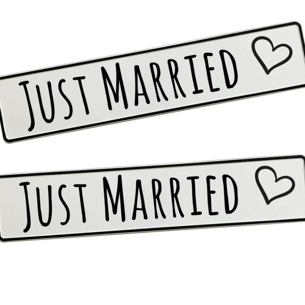 2x KFZ-Kennzeichen aus Aluminium, beschriftet mit Just Married und Motiv.