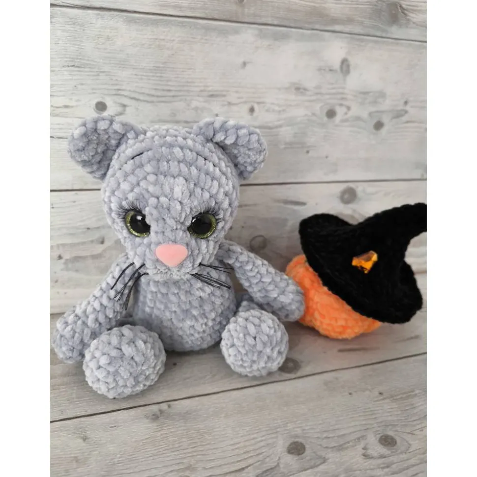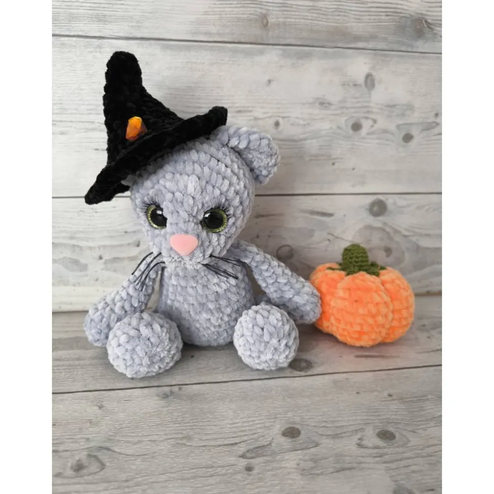 Farbe der Katze: Grau, Augen: Strahlend grün, Hut: Schwarzer Hexenhut, Accessoire: Weicher orangefarbener Kürbis (ca. 7 cm hoch),