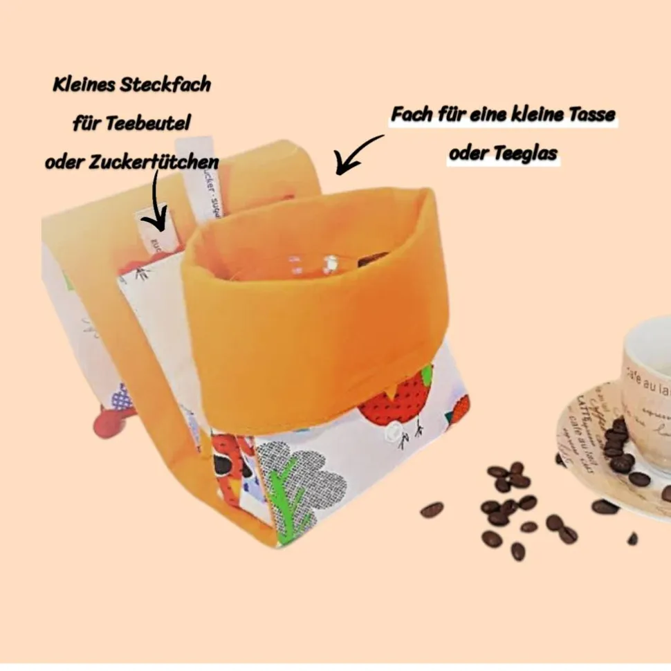 Diese Tasche bietet Stauraum für ein Kaffee- oder Teetasse, ein kleines Fach für Zuckertütchen oder Teebeutel. Tragegriff für ein schnelles mitnehmen und per Druckknopf verschließbar. Ob für den Arbeitsplatz oder als nettes Muttertags Geschenk. Nett befüllt mit Pralinen usw…, ist diese süße kleine Tasche auf jeden Fall ein „Hingucker“. Eine nette Idee auch als Mitbringsel gefüllt mit Gebäck, Süßem oder befüllt mit Wellness Produkten, wie z.B. Gesichtsmasken, Seifen, Handcreme…