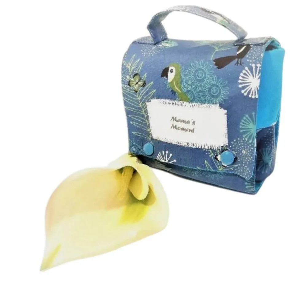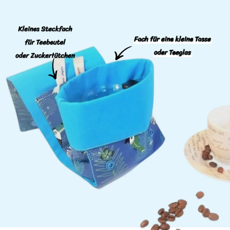 Diese Tasche bietet Stauraum für ein kleine Kaffee- oder Teetasse, ein kleines Fach für Zuckerbeutelchen oder Teebeutel. Tragegriff für ein schnelles mitnehmen, verschlossen per Kamsnaps. Ob für den Arbeitsplatz oder als nettes Muttertagesgeschenk mit dem Schriftzug „Mama´s Moment“. Nett befüllt mit Pralinen usw…, ist diese süße kleine Tasche auf jeden Fall ein „Hingucker“. Eine nette Idee auch als Mitbringsel gefüllt mit Gebäck oder Süßem.