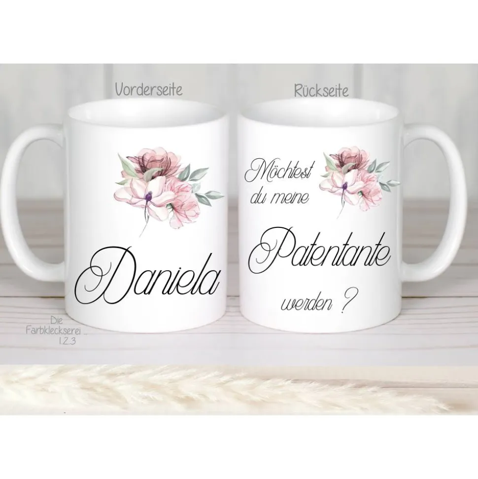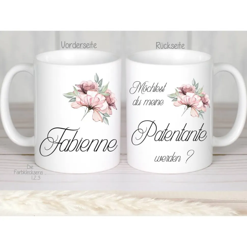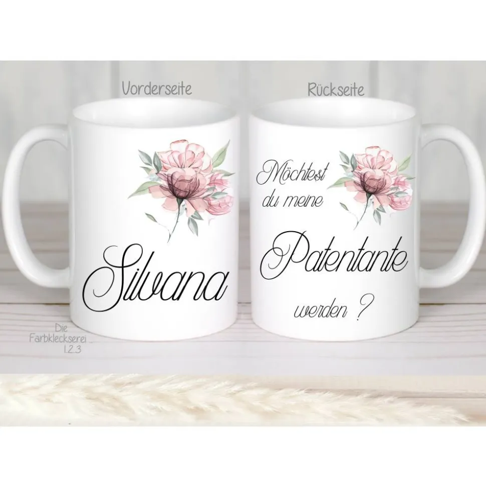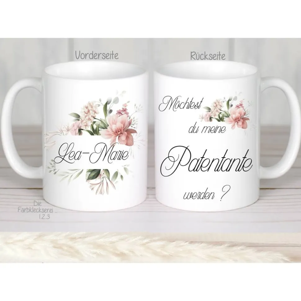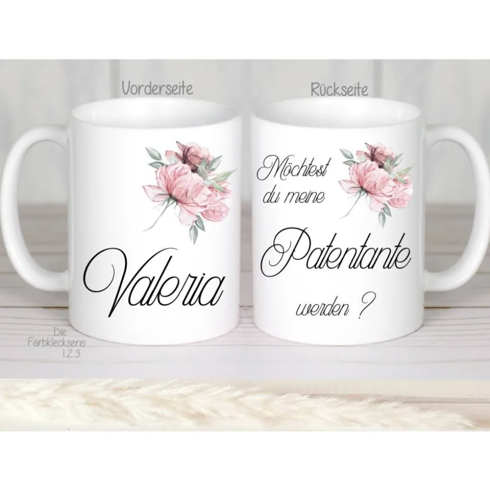 Die Tasse wird mit dem Vornamen der Taufpatin personalisiert und mit verschiedenen Blumen in Rosa bedruckt.