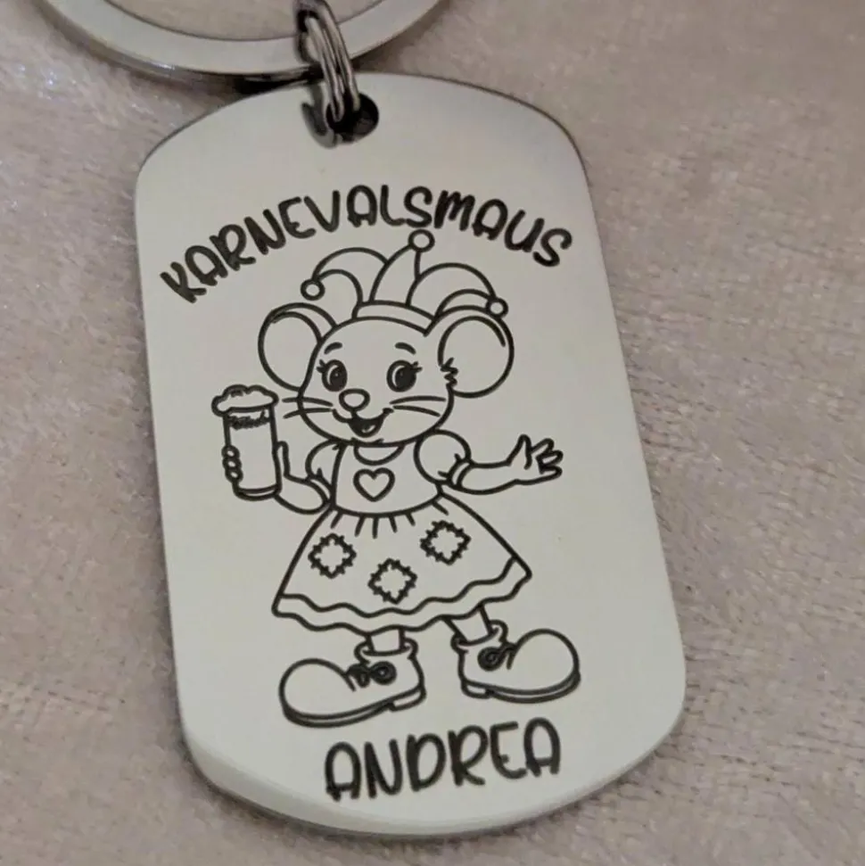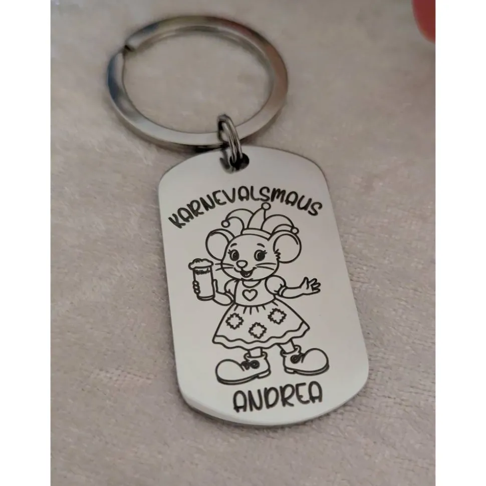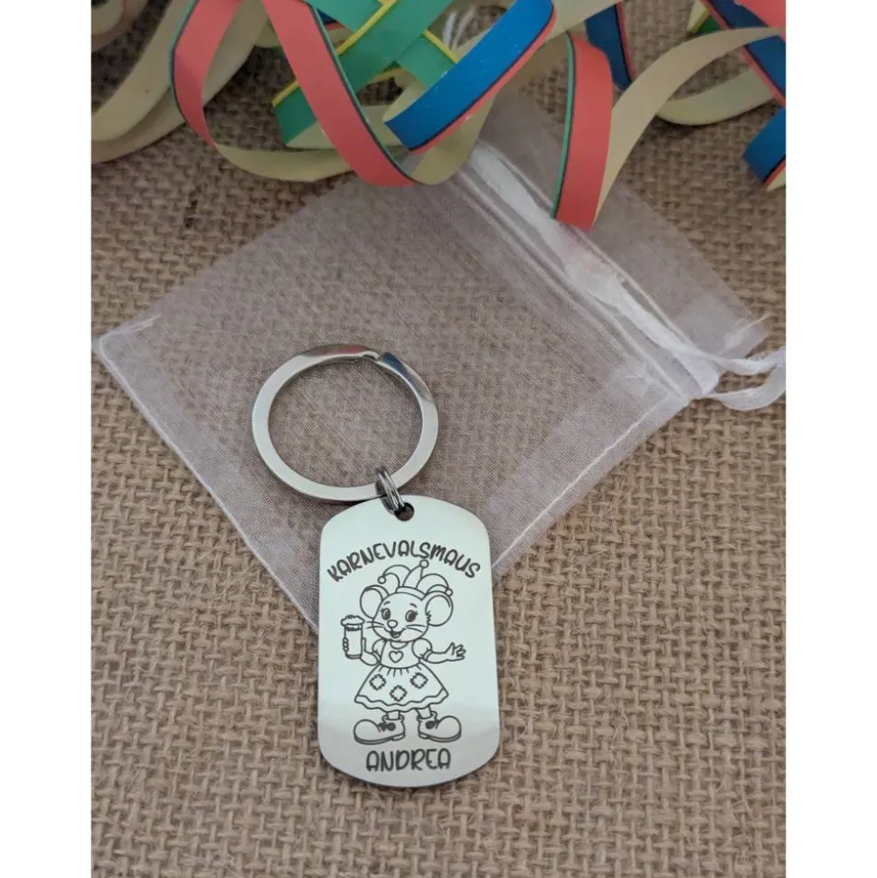 Karnevalsmaus Schlüsselanhänger– Personalisiert, rechteckig, rostfreier Edelstahl, tolles Accessoire für Karneval