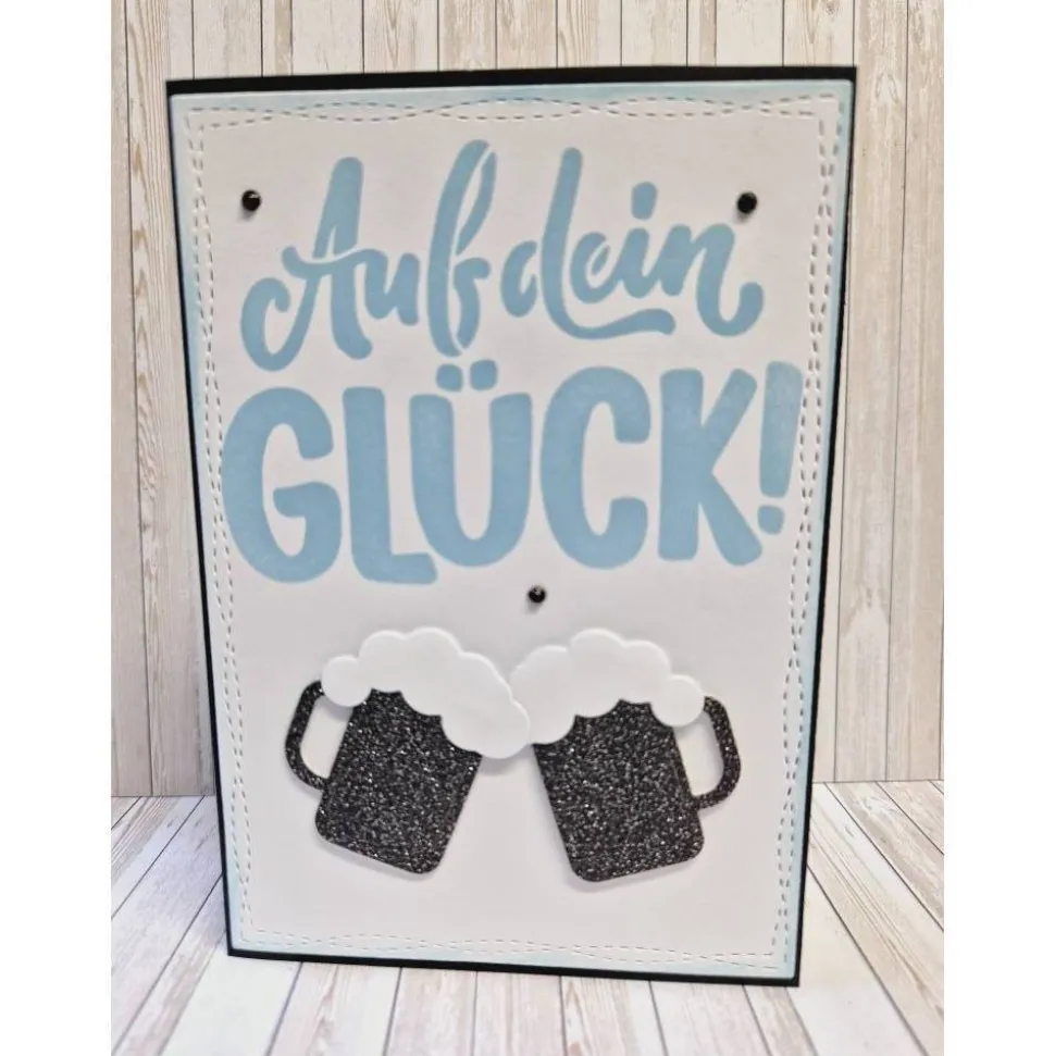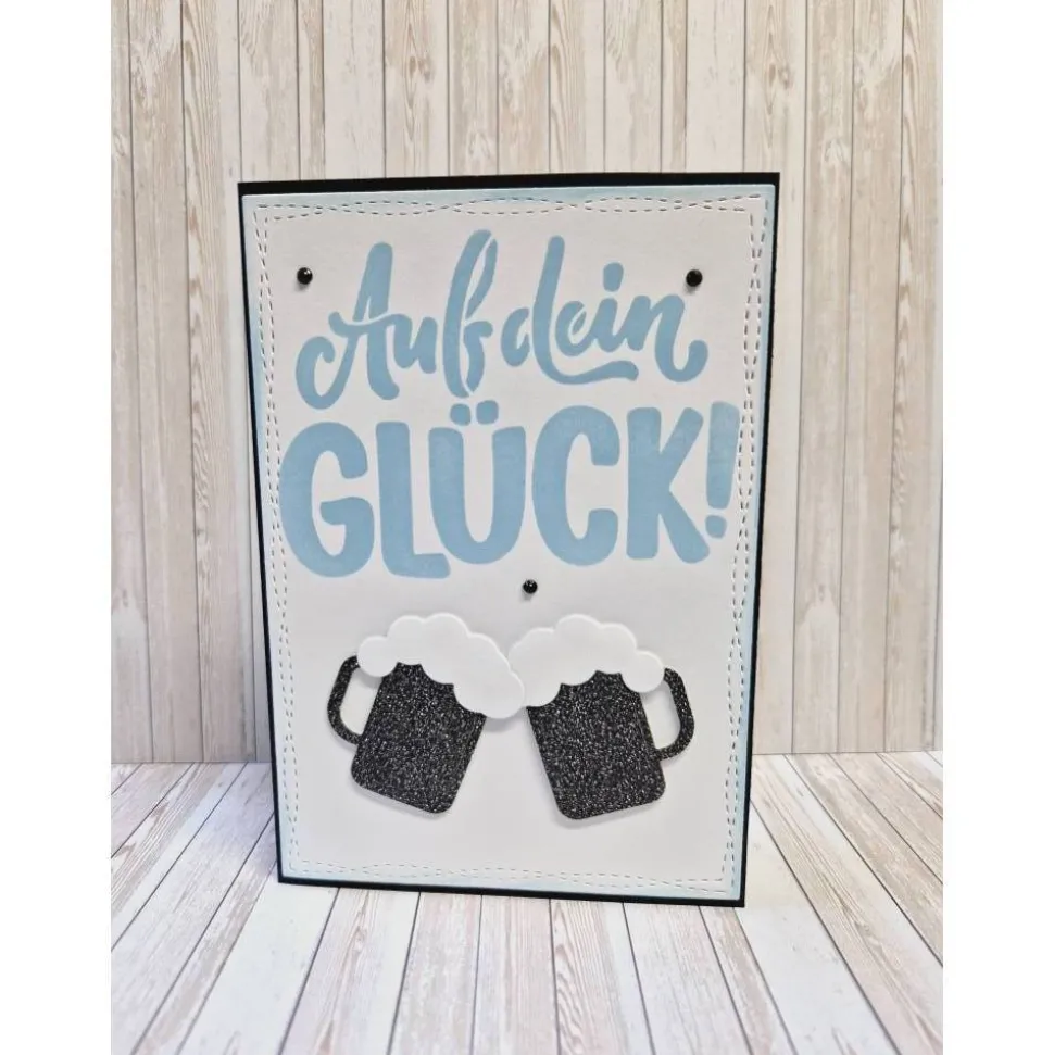DER WEIßE AUFLEGER MIT DEM SCHABLONIERTEN SPRUCH IST AUF EINE SCHWARZE KLAPPKARTE AUFGEKLEBT.AUF DIESEN AUFLEGER WURDEN STANZTEILE BIERKRÜGE UND DREI STRASSSTEINCHEN BEFESTIGT.