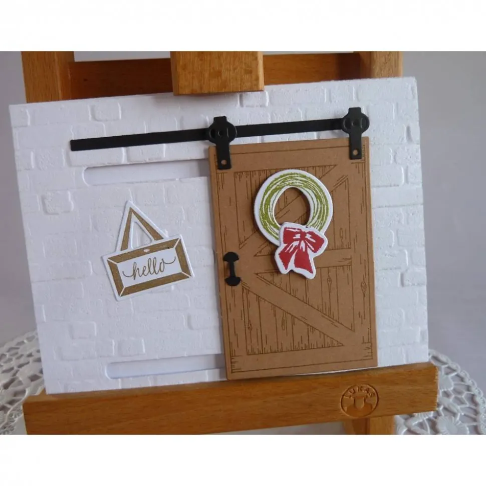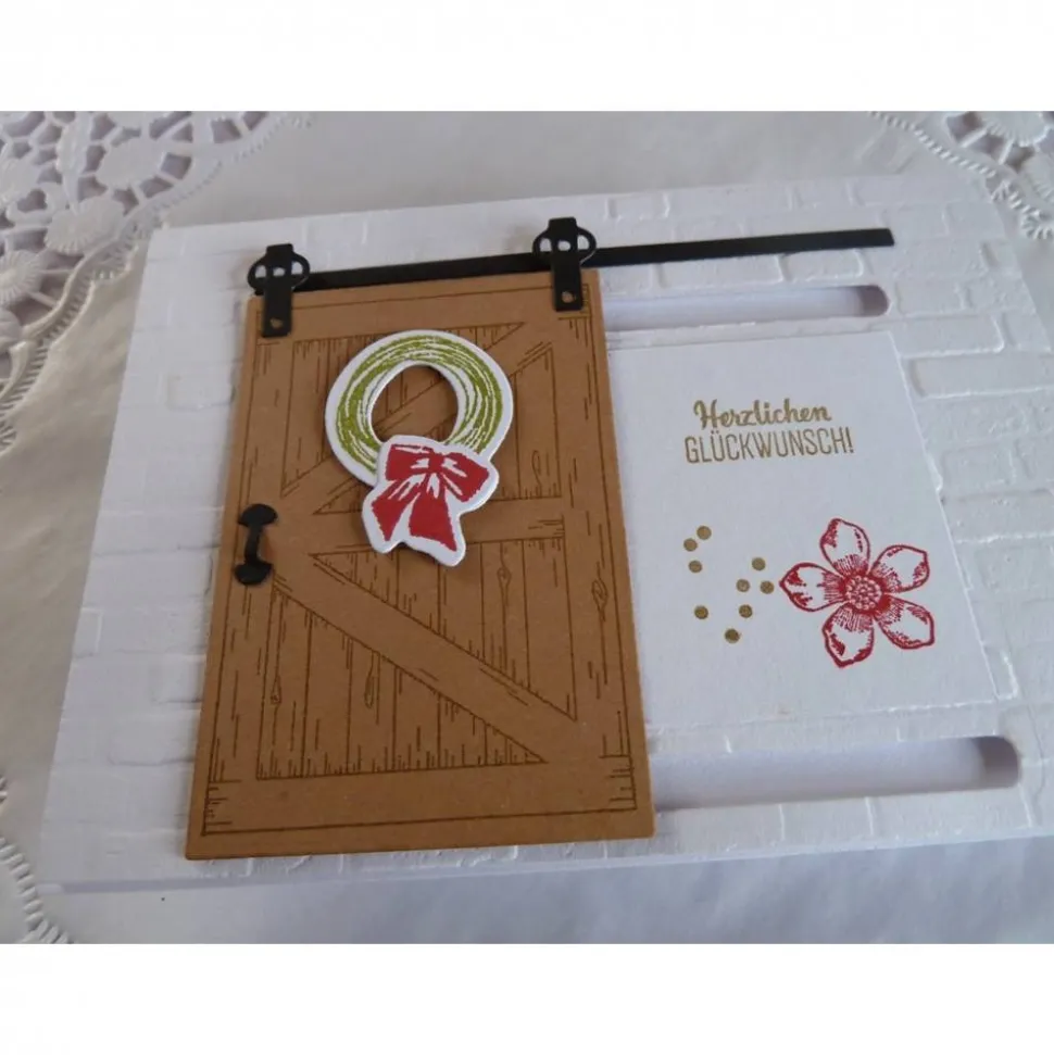 Die Glückwunschkarte hat eine Schiebefunktion mit der man die Tür verschieben kann. Hinter der Tür kommt dann der aufgestempelte Spruch mit einer Blüte zum Vorschein, die andere Seite schmückt ein Hängeschild. Den Hintergrund habe ich mit einer Prägeschablone in Ziegelsteinoptik geprägt, auf der Tür ist ein Kranz angebracht.