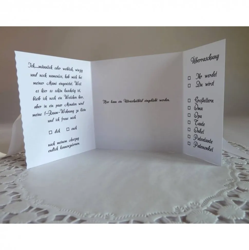 Von dieser Kartemit wunderschöner Prägung, in die ein Ultraschallbild eingeklebt werden kann und dem originellen Spruch, wird der Empfänger bestimmt begeistert sein. Du kannst selbst ankreuzen für wen die Karte bestimmt ist.