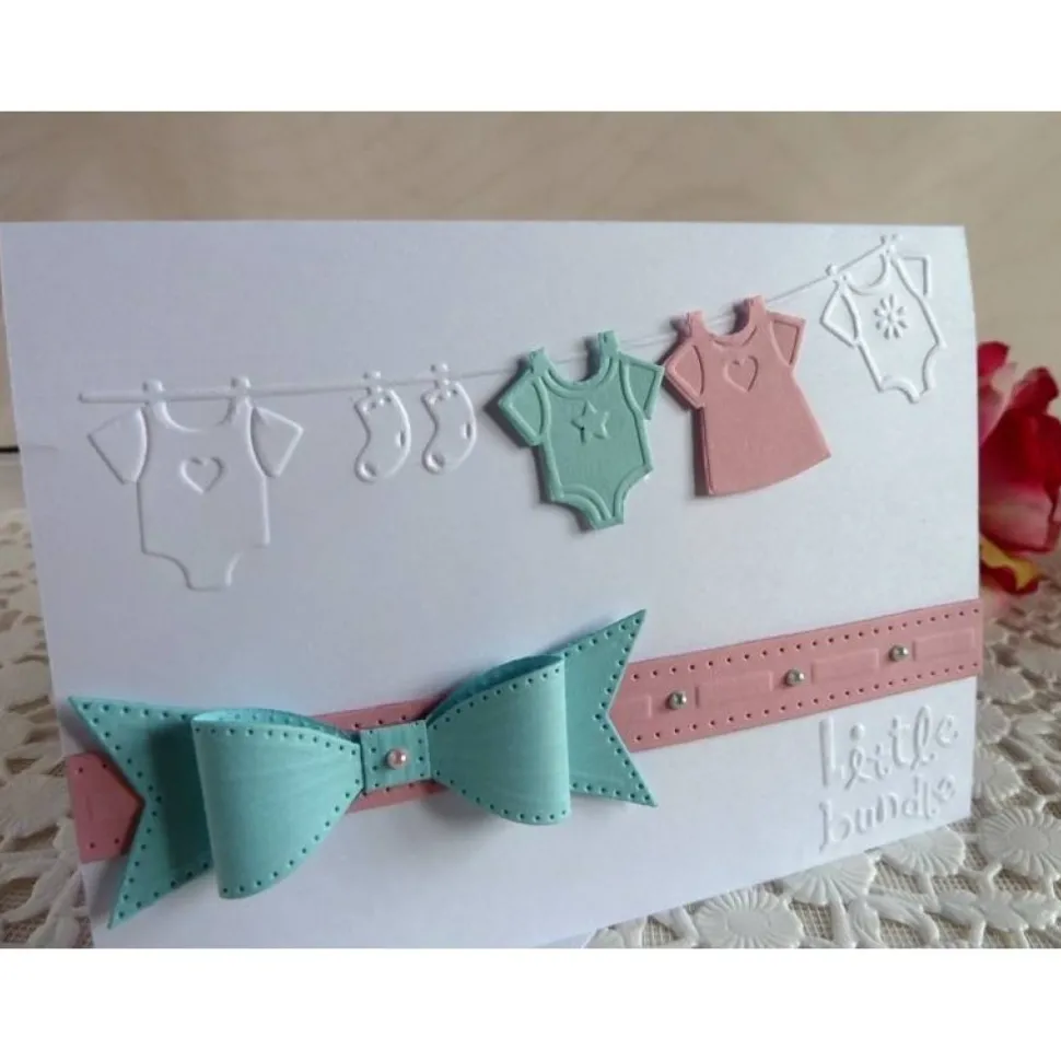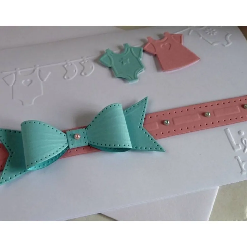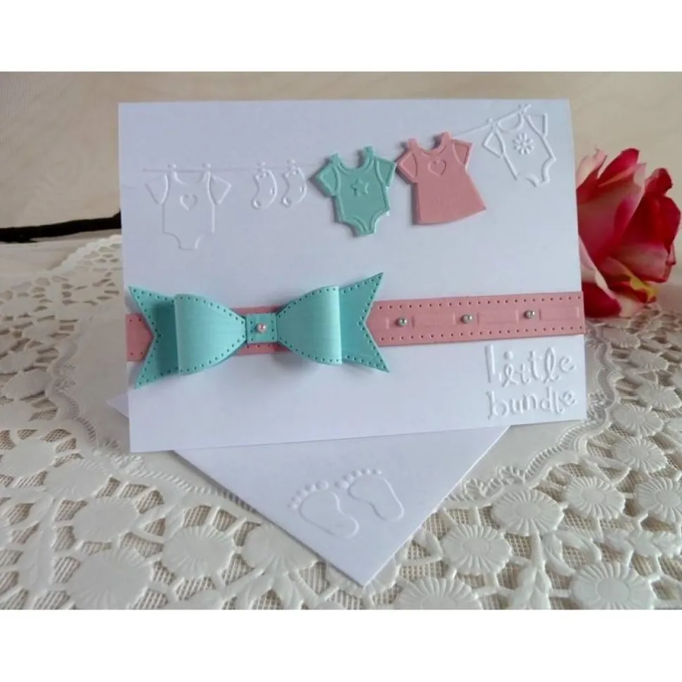 Die Karte ist in hellblau/rosa gehalten, mit schöner Wäscheleinenprägung und rosa Kleidchen, hellblauem Body und Schleife, mit Halbperlen dekoriert und das Kuvert hat aufgeprägte Babyfüsschen
