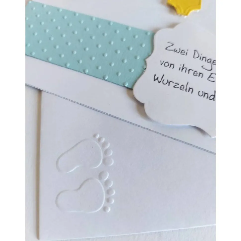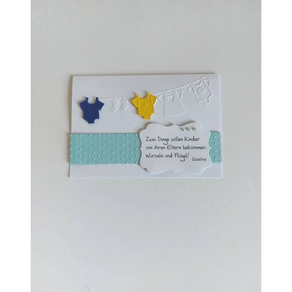 Die Karte ist in weiß/hellblau gehalten, mit einer Wäscheleinenprägung auf der ein blauer und gelber Body hängt, mit schönen aufgestempelten Spruch und mit Halbperlen dekoriert, das Kuvert hat aufgeprägte Babyfüsschen