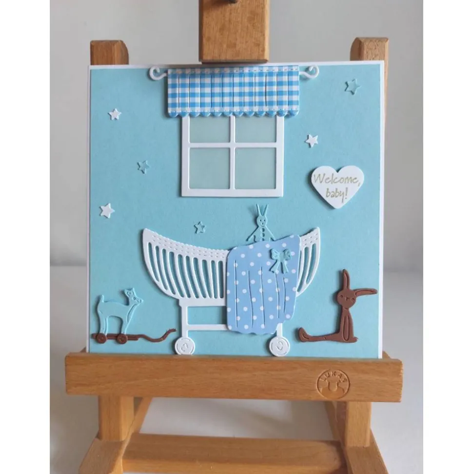 Aufwendig gearbeitete quadratische Klappkarte zur Geburt oderTaufe, die ich als Kinderzimmer dargestellt habe, sie kann auch in anderer Farbe und als Taufeinladung gearbeitet werden. Auf das Kuvert sind kleine Babyfüßchen geprägt. Die Klappkarte wird mit Kuvert und Klarsichtshülle geliefert.