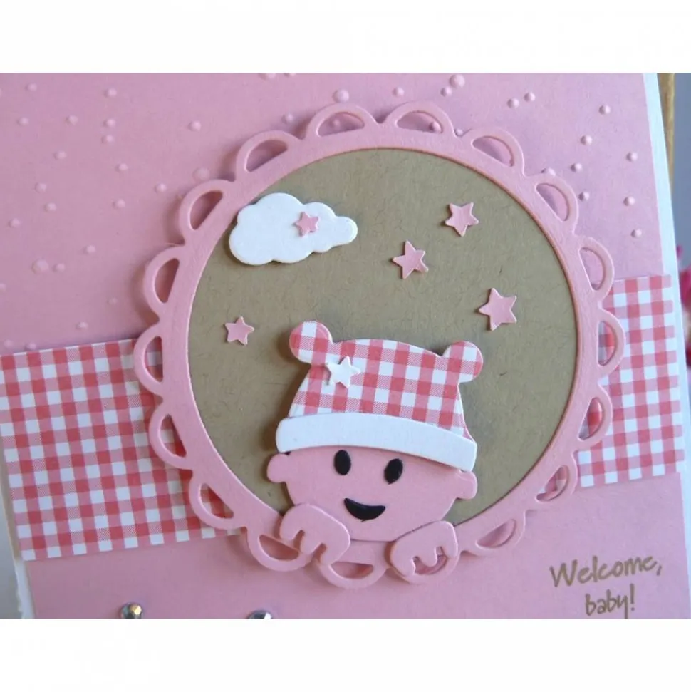 Aufwendig gearbeitete quadratische Klappkarte mit teilgeprägtem Hintergrund und kariertem Papier, dekoriert mit Sternen und Glitzersteinen. Auf das Kuvert sind kleine Babyfüßchen geprägt. Die Klappkarte wird mit Kuvert, Einlegeblatt und verpackt in einer Klarsichtshülle geliefert.