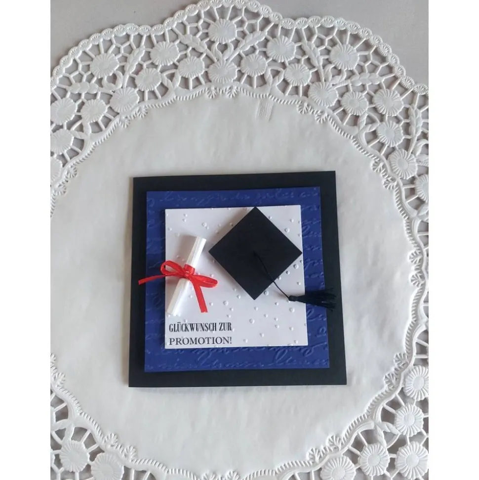 Klappkarte in Handarbeit gefertigt für jeden schulischen Abschluss, mit geprägtem Hintergrund, Doktorhut, handgefertigter Quaste und Schriftrolle. Die Glückwunschkarte wird mit Einlegeblatt und Kuvert geliefert.