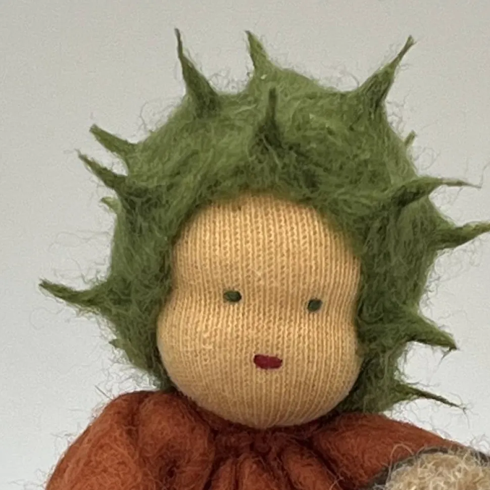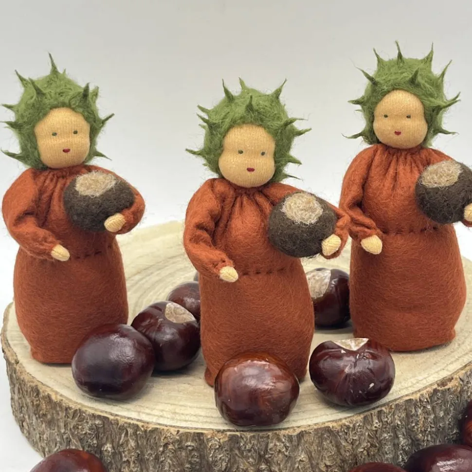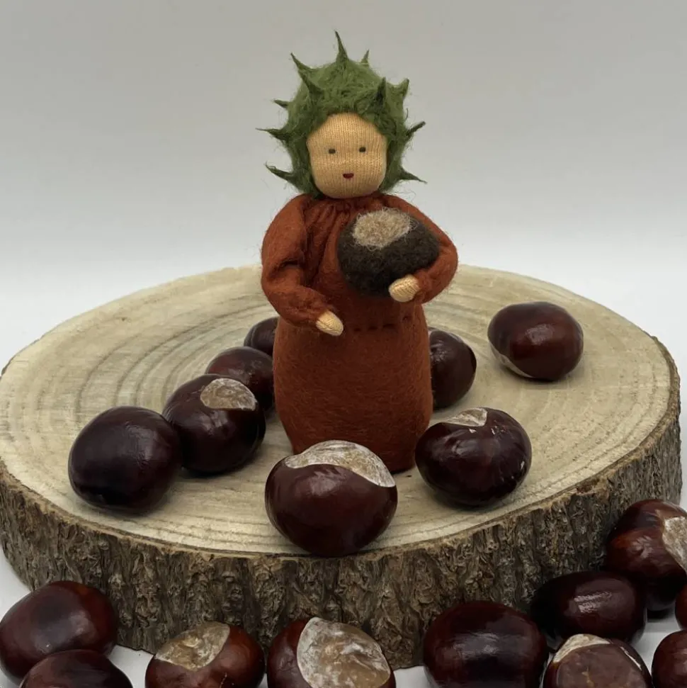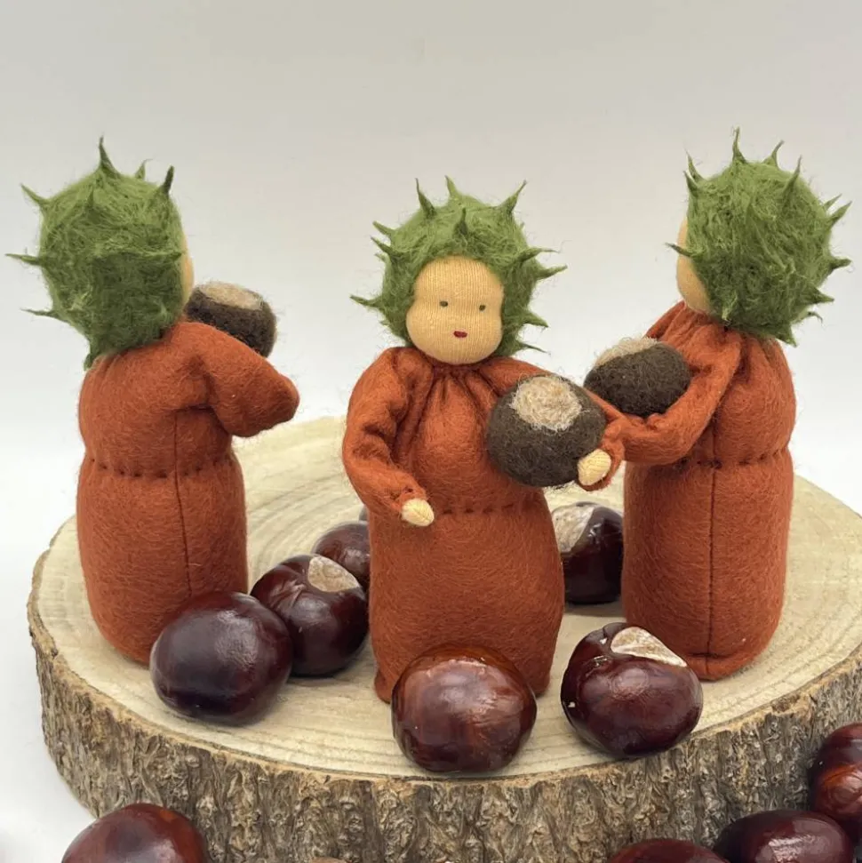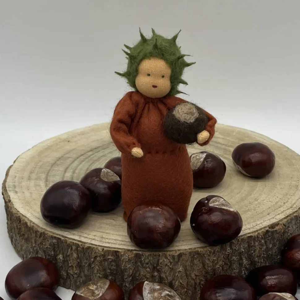 Sie sind ca. 12 cm groß. Er hat eine gefilzte Kastanie im Arm.