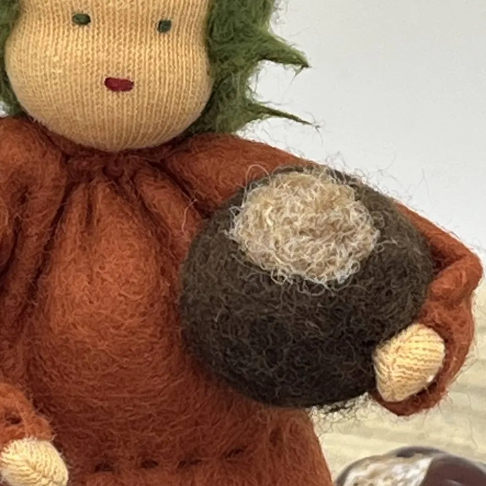 Das Püppchen ist unten geschlossen und für einen guten Stand unten mit feinem Dekokies und der Rest mit reiner, süddeutsche Merinowolle gefüllt.