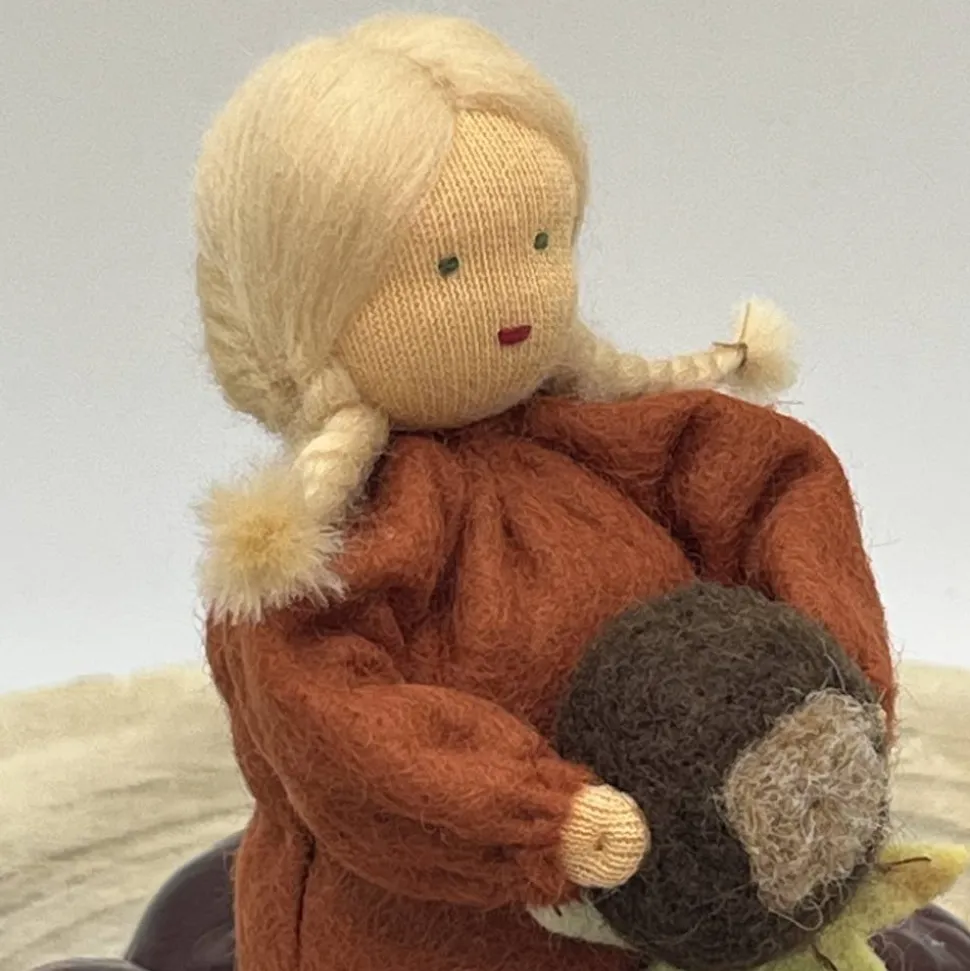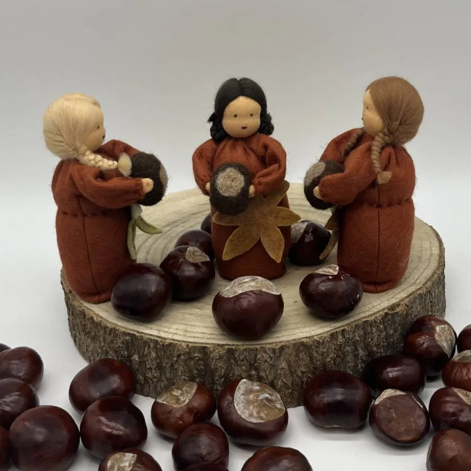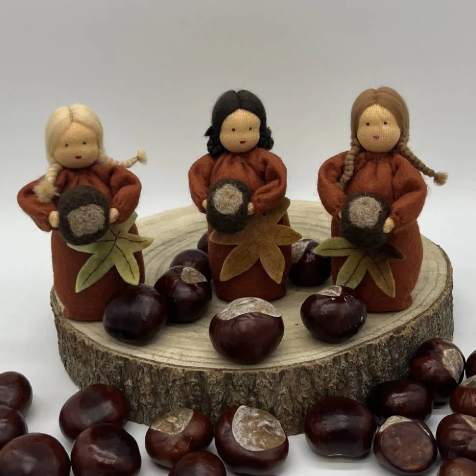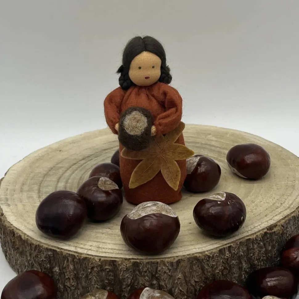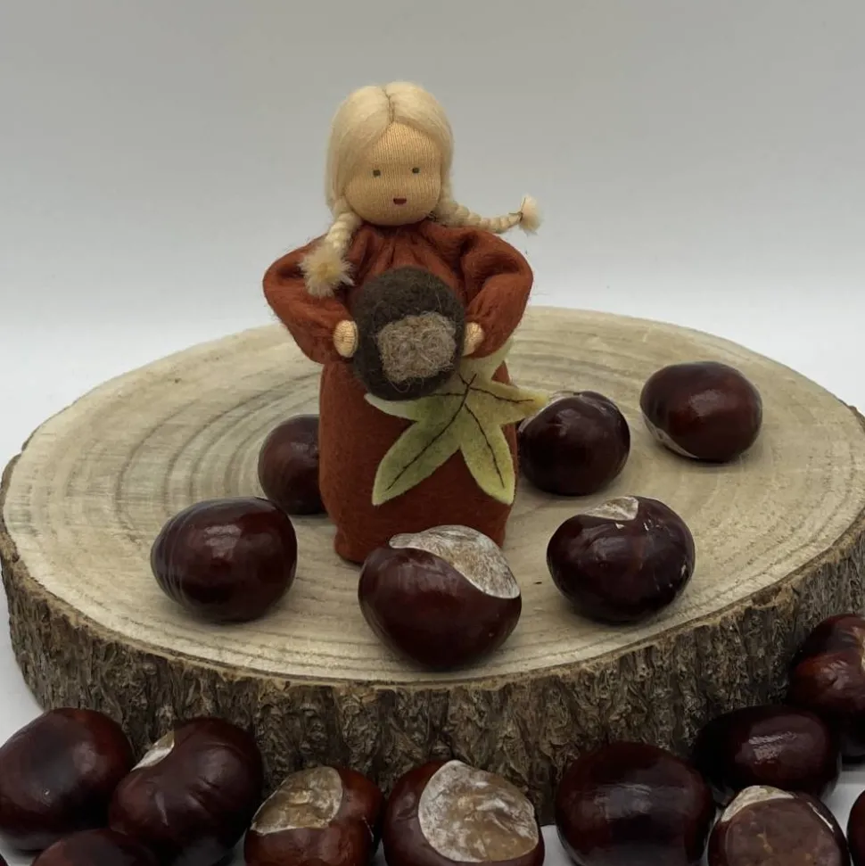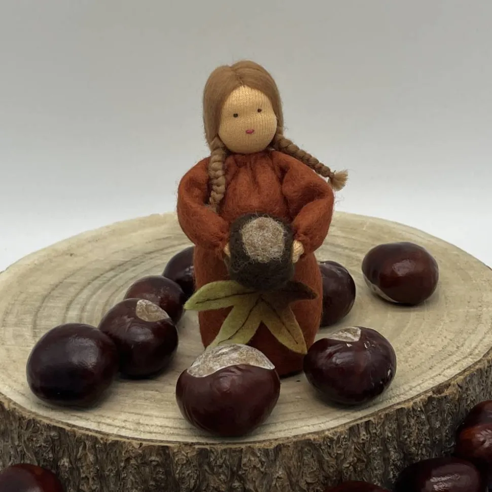 Sie sind ca. 12 cm groß und halten eine gefilzte Kastanie in den Händen.
