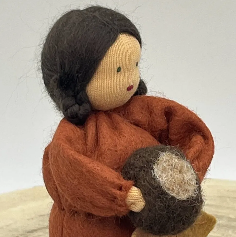 Das Püppchen ist unten geschlossen und für einen guten Stand unten mit feinem Dekokies und der Rest mit reiner, süddeutsche Merinowolle gefüllt.