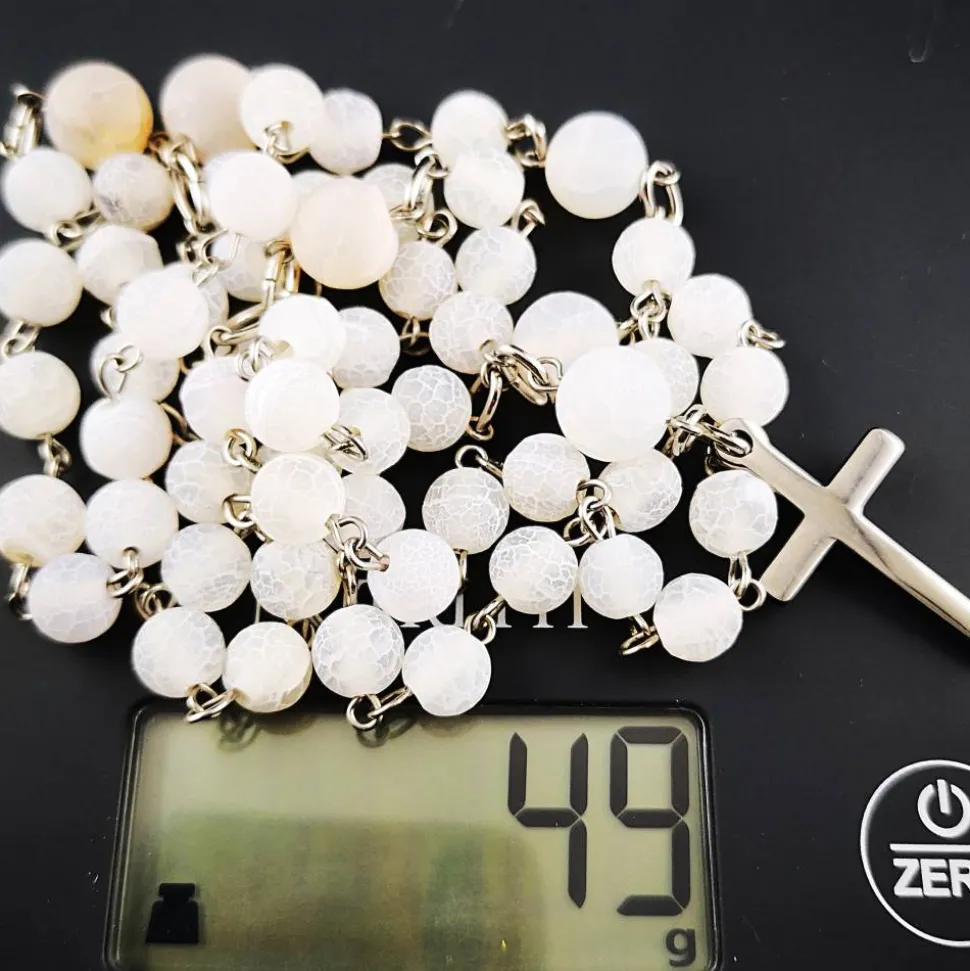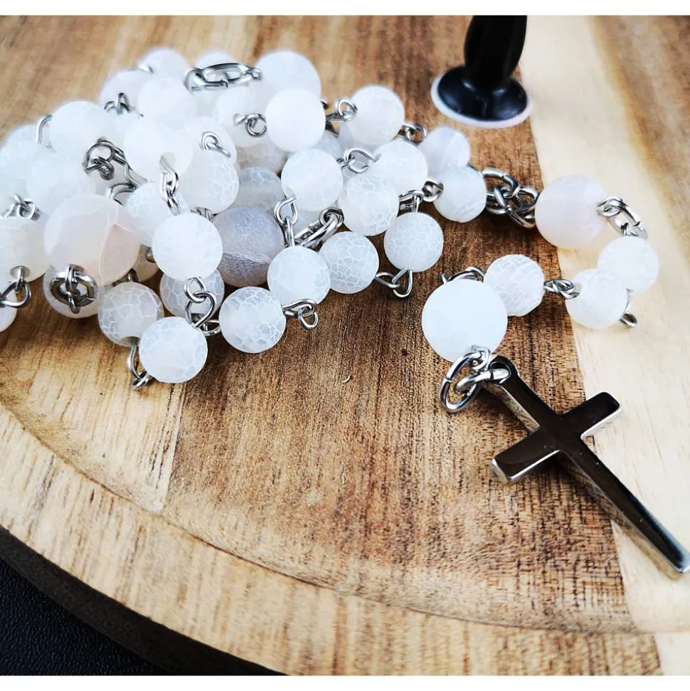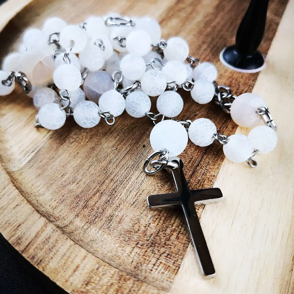 Die 8 mm und 10 mm großen Perlen sind in einem eleganten weiß-silbernen Design angeordnet und werden von hochwertigen Edelstahl-Kettelstiften, Verbindungsringen und einem schlichten Kreuz ergänzt.