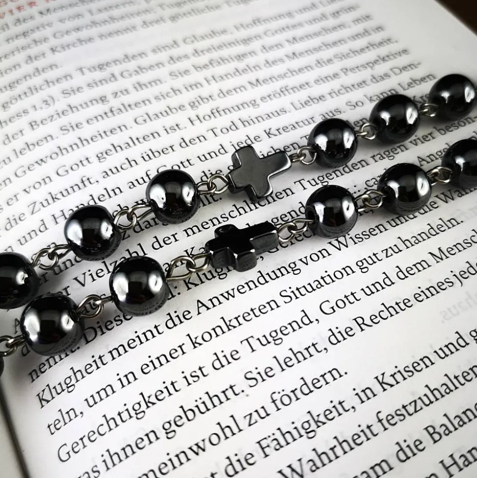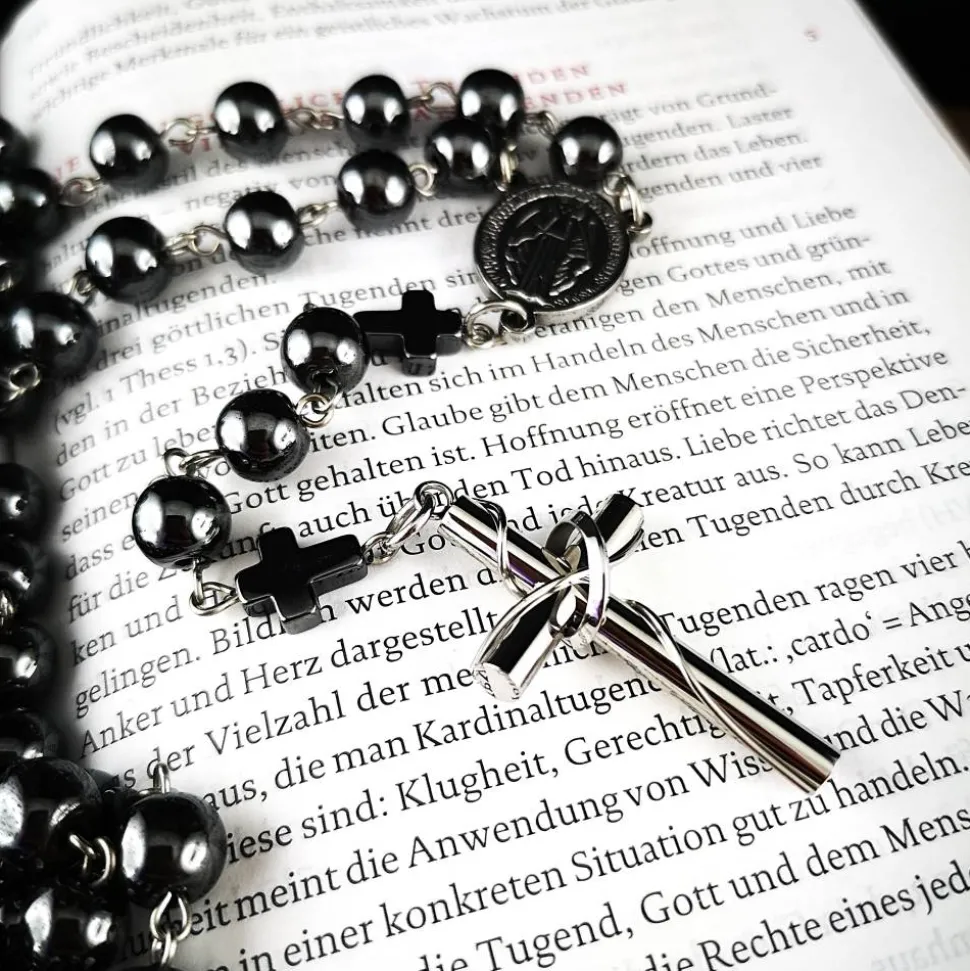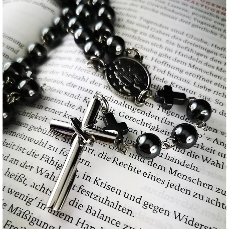 Entdecke den katholischen Rosenkranz mit Hämatitperlen (unmagnetisch) und Edelstahl – das perfekte Schmuckstück, das traditionelle Spiritualität und modernes Design in einem einzigartigen Accessoire verbindet.